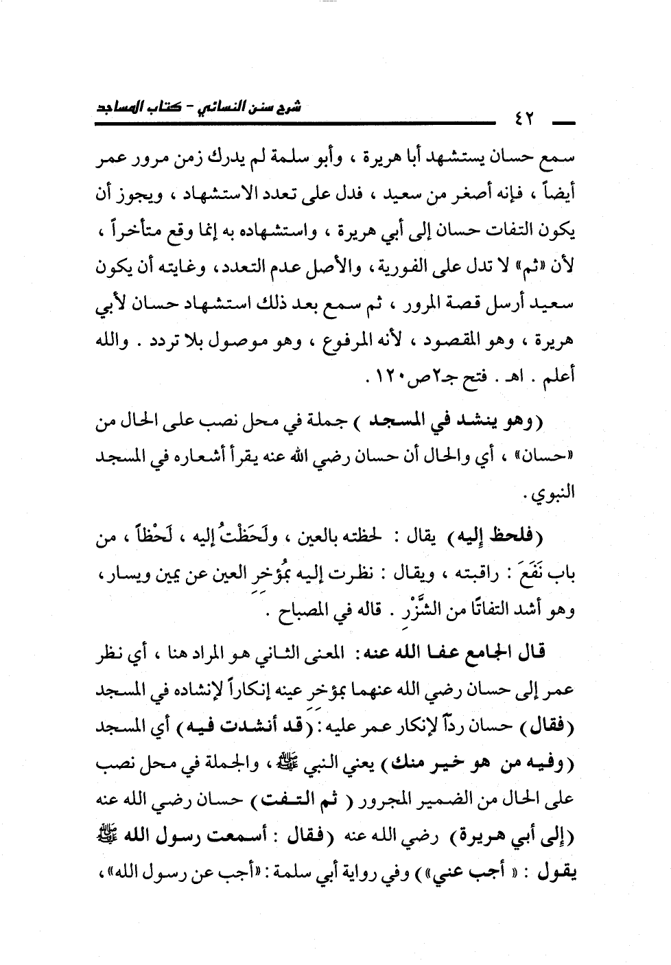 سمع حسان يستشهد أبا هريرة، وأبو سلمة لم يدرك زمن مرور عمر أيضًا، فإنه أصغر من سعيد، فدل على تعدد الاستشهاد، ويجوز أن يكون التفات حسان إلى أبي هريرة، واستشهاده به إنما وقع متأخرًا، لأن "ثم" لا تدل على الفورية، والأصل عدم التعدد، وغايته أن يكون سعيد أرسل قصة المرور، ثم سمع بعد ذلك استشهاد حسان لأبي هريرة، وهو المقصود؛ لأنه المرفوع، وهو مو صول بلا تردد. والله أعلم. اهـ. فتح جـ 2 ص 120.