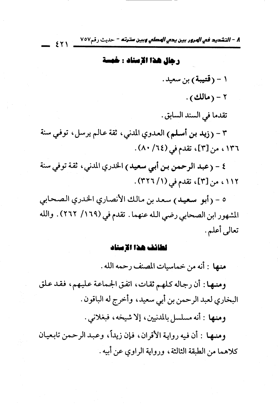ومنها: أن رجاله كلهم ثقات، اتفق الجماعة عليهم، فقد علق البخاري لعبد الرحمن بن أبي سعيد، وأخرج له الباقون.