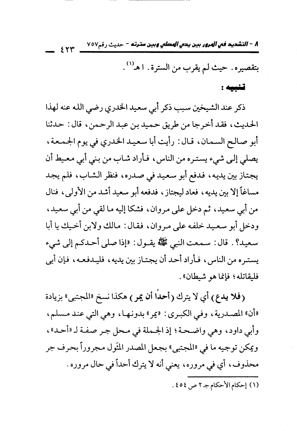 ذكر عند الشيخين سبب ذكر أبي سعيد الخدري رضي الله عنه لهذا الحديث، فقد أخرجا من طريق حميد بن عبد الرحمن، قال: حدثنا أبو صالح السمان، قال: رأيت أبا سعيد الخدري في يوم الجمعة، يصلي إلى شيء يستره من الناس، فأراد شاب من بني أبي معيط أن يجتاز بين يديه، فدفع أبو سعيد في صدره، فنظر الشاب، فلم يجد مساغاً إلا بين يديه، فعاد ليجتاز، فدفعه أبو سعيد أشد من الأولى، فنال من أبي سعيد، ثم دخل على مروان، فشكا إليه ما لقي من أبي سعيد، ودخل أبو سعيد خلفه على مروان، فقال: مالك ولابن أخيك يا أبا سعيد؟. قال: سمعت النبي -صلى الله عليه وسلم- يقول: "إذا صلى أحدكم إلى شيء يستره من الناس، فأراد أحد أن يجتاز بين يديه، فليدفعه، فإن أبى فليقاتله؛ فإنما هو شيطان".
