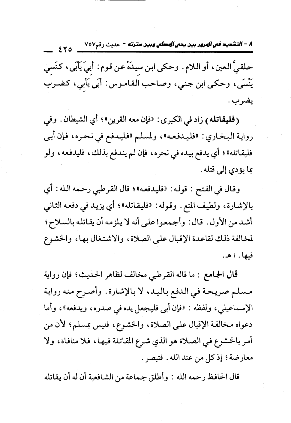 قال الجامع: ما قاله القرطبي مخالف لظاهر الحديث؛ فإن رواية مسلم صريحة في الدفع باليد، لا بالإشارة. وأصرح منه رواية الإسماعيلي، ولفظه: "فإن أبى فليجعل يده في صدره، ويدفعه"، وأما دعواه مخالفة الإقبال على الصلاة، والخشوع، فليس بمسلم؛ لأن من أمر بالخشوع في الصلاة هو الذي شرع المقاتلة فيها، فلا منافاة، ولا معارضة؛ إذ كل من عند الله. فتبصر.