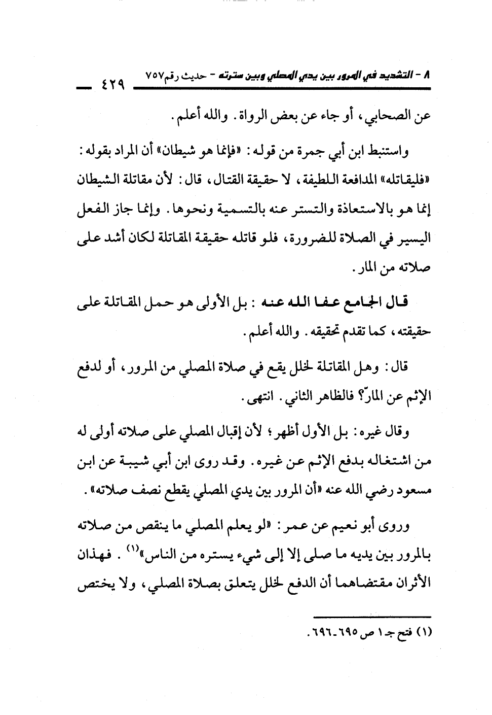 وقال غيره: بل الأول أظهر؛ لأن إقبال المصلي على صلاته أولى له من اشتغاله بدفع الإثم عن غيره. وقد روى ابن أبي شيبة عن ابن مسعود رضي الله عنه "أن المرور بين يدي المصلي يقطع نصف صلاته".