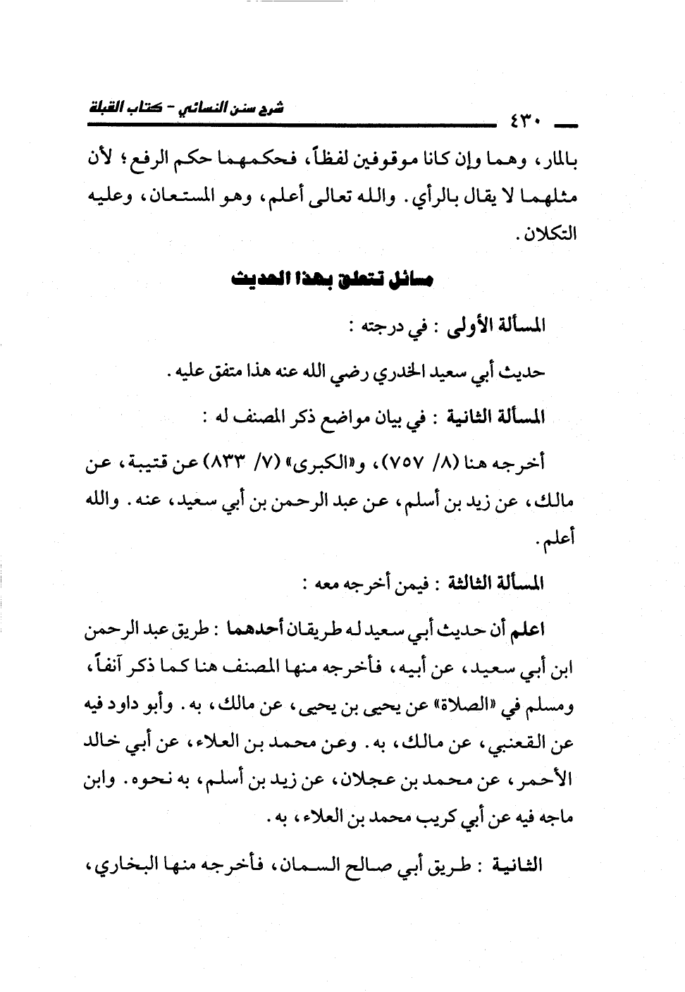 اعلم أن حديث أبي سعيد له طريقان أحدهما: طريق عبد الرحمن ابن أبي سعيد، عن أبيه، فأخرجه منها المصنف هنا كما ذكر آنفاً، ومسلم في "الصلاة" عن يحيى بن يحيى، عن مالك، به. وأبو داود فيه عن القعنبي، عن مالك، به. وعن محمد بن العلاء، عن أبي خالد الأحمر، عن محمد بن عجلان، عن زيد بن أسلم، به نحوه. وابن ماجه فيه عن أبي كريب محمد بن العلاء، به.