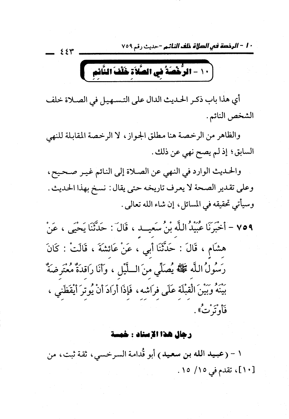 10 - الرُّخْصَةُ فِي الصَّلاَةِ خَلْفَ النَّائِمِ