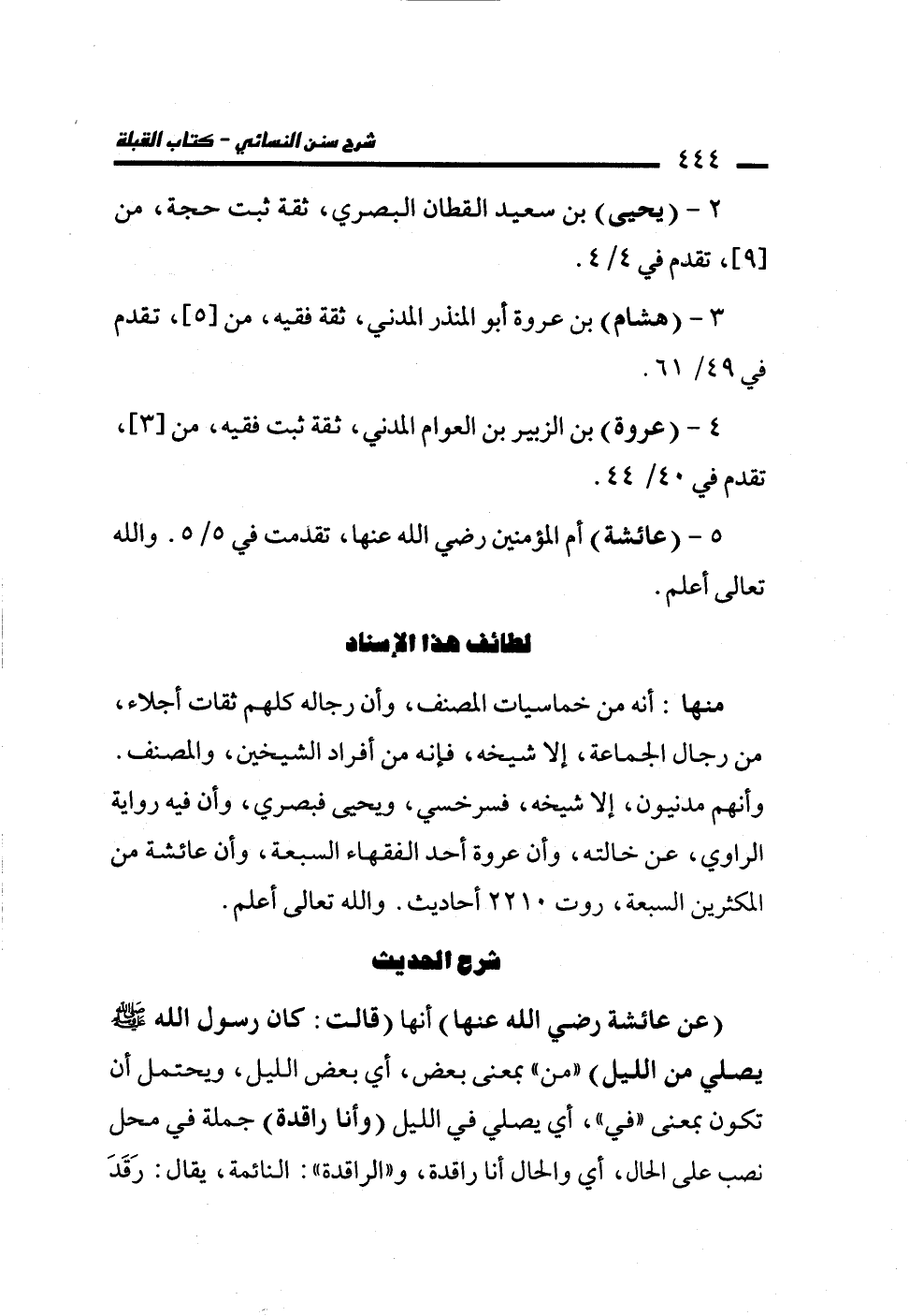 منها: أنه من خماسيات المصنف، وأن رجاله كلهم ثقات أجلاء، من رجال الجماعة، إلا شيخه، فإنه من أفراد الشيخين، والمصنف. وأنهم مدنيون، إلا شيخه، فسرخسي، ويحيى فبصري، وأن فيه رواية الراوي، عن خالته، وأن عروة أحد الفقهاء السبعة، وأن عائشة من المكثرين السبعة، روت 2210 أحاديث. والله تعالى أعلم.