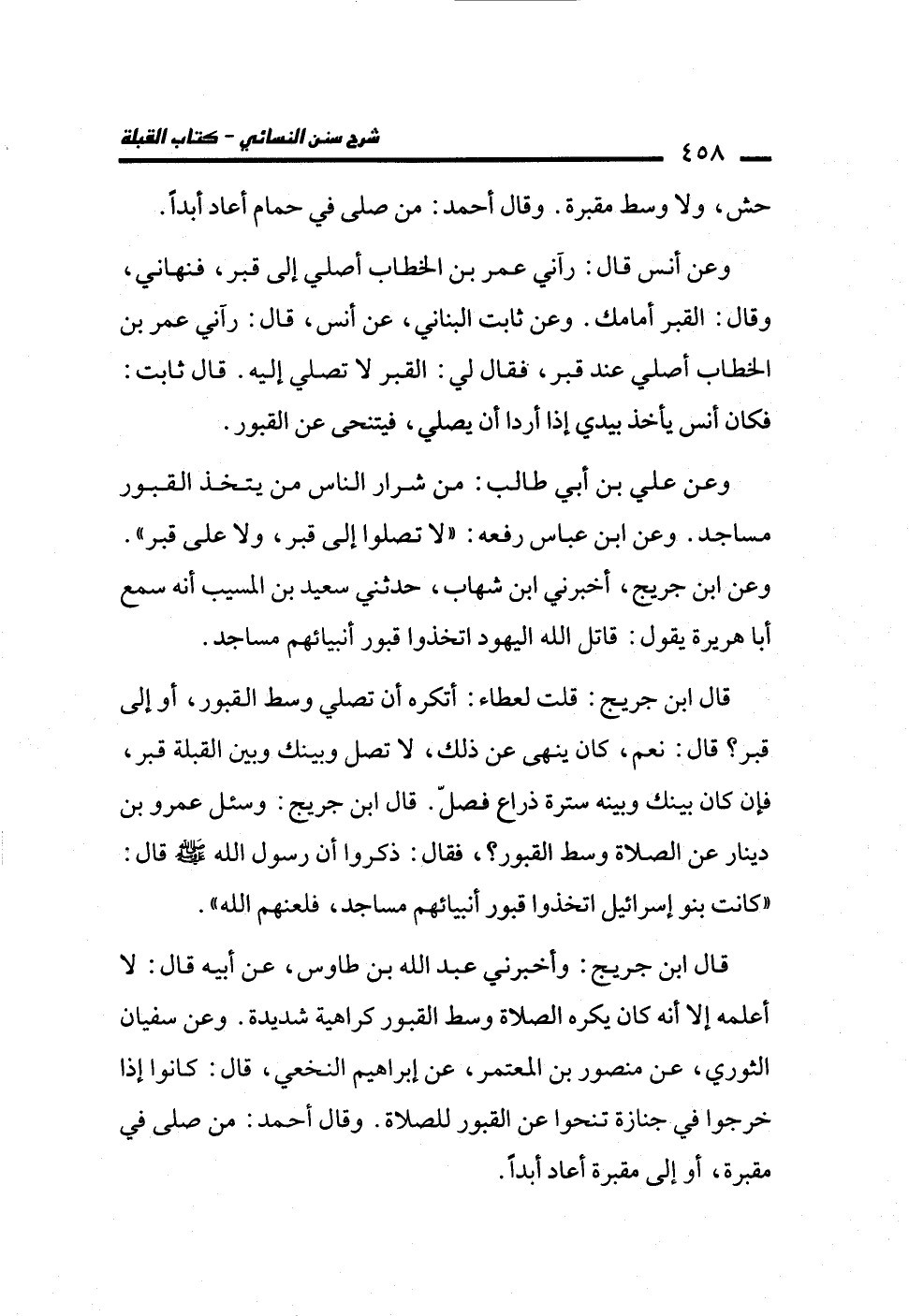 قال ابن جريج: وأخبرني عبد الله بن طاوس، عن أبيه قال: لا أعلمه إلا أنه كان يكره الصلاة وسط القبور كراهية شديدة. وعن سفيان الثوري، عن منصور بن المعتمر، عن إبراهيم النخعي، قال: كانوا إذا خرجوا في جنازة تنحوا عن القبور للصلاة. وقال أحمد: من صلى في مقبرة، أو إلى مقبرة أعاد أبداً.