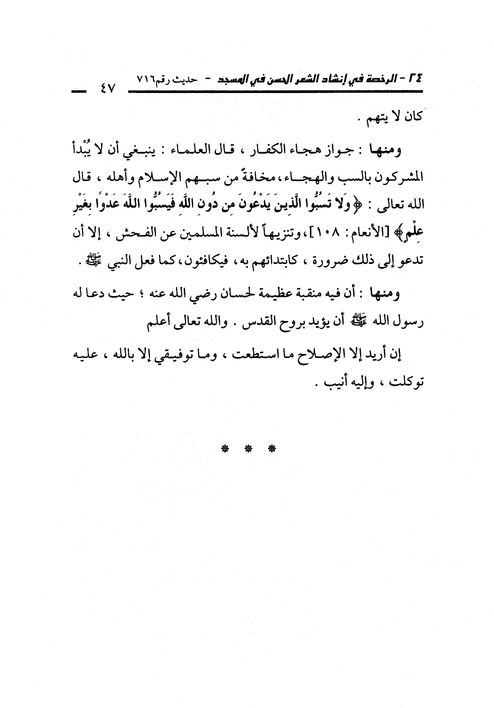 ومنها: جواز هجاء الكفار، قال العلماء: ينبغي أن لا يُبْدأ المشركون بالسب والهجاء، مخافةً من سبهم الإِسلام وأهله، قال الله تعالى: {وَلَا تَسُبُّوا الَّذِينَ يَدْعُونَ مِنْ دُونِ اللَّهِ فَيَسُبُّوا اللَّهَ عَدْوًا بِغَيْرِ عِلْمٍ} [الأنعام: 108]، وتنزيهًا لألسنة المسلمين عن الفحش، إلا أن تدعو إلى ذلك ضرورة، كابتدائهم به، فيكافئون، كما فعل النبي -صلى الله عليه وسلم-.