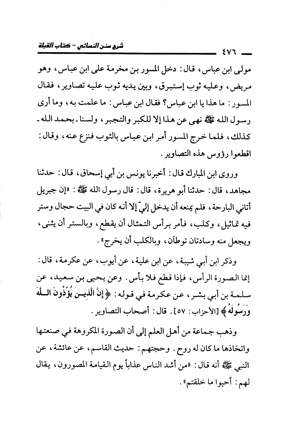 وذكر ابن أبي شيبة، عن ابن علية، عن أيوب، عن عكرمة، قال: إنما الصورة الرأس، فإذا قطع فلا بأس. وعن يحيى بن سعيد، عن سلمة بن أبي بشر، عن عكرمة في قوله: {إِنَّ الَّذِينَ يُؤْذُونَ اللَّهَ وَرَسُولَهُ} [الأحزاب: 57]. قال: أصحاب التصاوير.