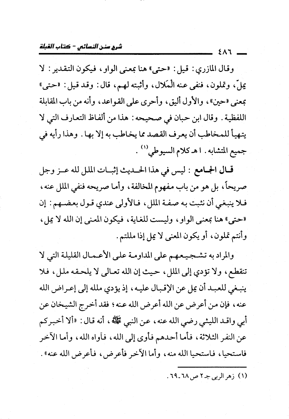 قال الجامع: ليس في هذا الحديث إثبات الملل لله عز وجل صريحاً، بل هو من باب مفهوم المخالفة، وأما صريحه فنفي الملل عنه، فلا ينبغي أن نثبت به صفة الملل، فالأولى عندي قول بعضهم: إن "حتى" هنا بمعنى الواو، وليست للغاية، فيكون المعنى إن الله لا يمل، وأنتم تملون، أو يكون المعنى لا يمل إذا مللتم.