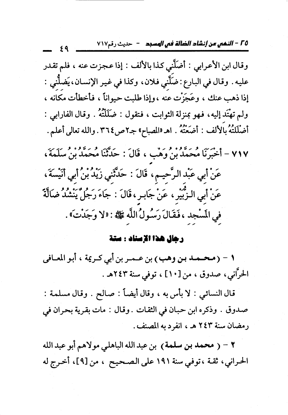717 - أَخْبَرَنَا مُحَمَّدُ بْنُ وَهْبٍ، قَالَ: حَدَّثَنَا مُحَمَّدُ بْنُ سَلَمَةَ، عَنْ أَبِي عَبْدِ الرَّحِيمِ، قَالَ: حَدَّثَنِي زَيْدُ بْنُ أَبِي أُنَيْسَةَ، عَنْ أَبِي الزُّبَيْرِ، عَنْ جَابِرٍ، قَالَ: جَاءَ رَجُلٌ يَنْشُدُ ضَالَّةً فِي الْمَسْجِدِ، فَقَالَ لَهُ رَسُولُ اللَّهِ -صلى الله عليه وسلم-: "لاَ وَجَدْتَ".