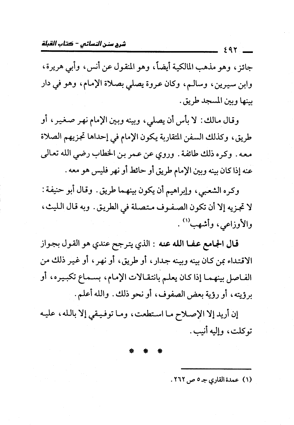 وكره الشعبي، وإبراهيم أن يكون بينهما طريق. وقال أبو حنيفة: لا تجزيه إلا أن تكون الصفوف متصلة في الطريق. وبه قال الليث، والأوزاعي، وأشهب (¬1).