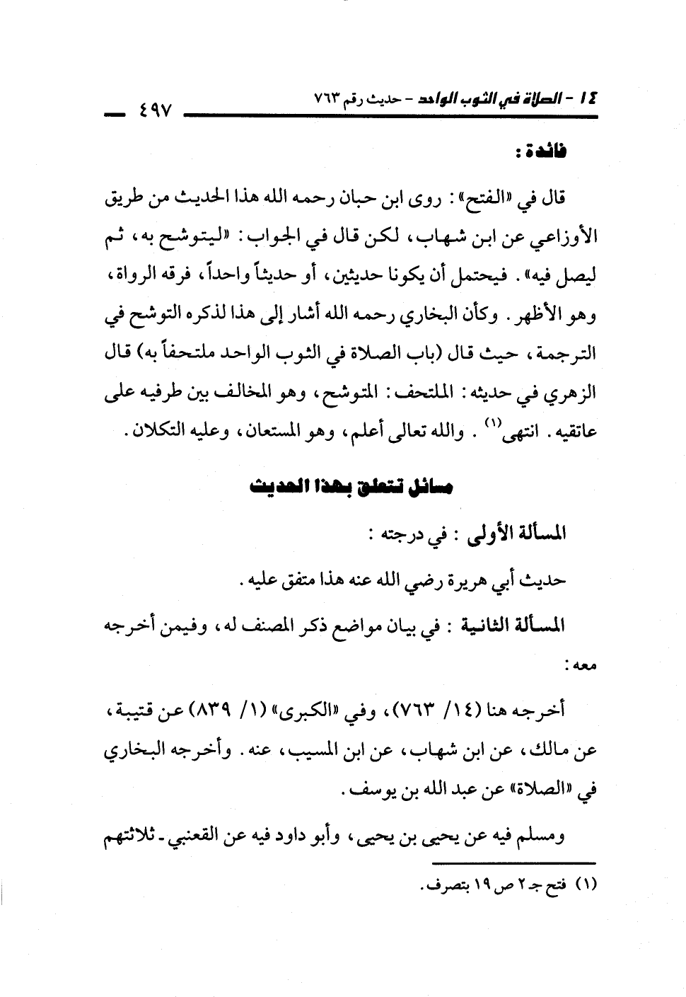 قال في "الفتح": روى ابن حبان رحمه الله هذا الحديث من طريق الأوزاعي عن ابن شهاب، لكن قال في الجواب: "ليتوشح به، ثم ليصل فيه". فيحتمل أن يكونا حديثين، أو حديثاً واحداً، فرقه الرواة، وهو الأظهر. وكأن البخاري رحمه الله أشار إلى هذا لذكره التوشح في الترجمة، حيث قال (باب الصلاة في الثوب الواحد ملتحفاً به) قال الزهري في حديثه: الملتحف: المتوشح، وهو المخالف بين طرفيه على عاتقيه. انتهى (¬1). والله تعالى أعلم، وهو المستعان، وعليه التكلان.