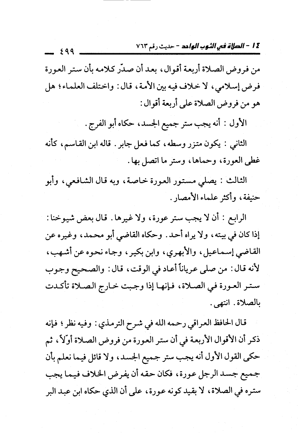 قال الحافظ العراقي رحمه الله في شرح الترمذي: وفيه نظر؛ فإنه ذكر أن الأقوال الأربعة في أن ستر العورة من فروض الصلاة أوّلاً، ثم حكى القول الأول أنه يجب ستر جميع الجسد، ولا قائل فيما نعلم بأن جميع جسد الرجل عورة، فكان حقه أن يفرض الخلاف فيما يجب ستره في الصلاة، لا بقيد كونه عورة، على أن الذي حكاه ابن عبد البر