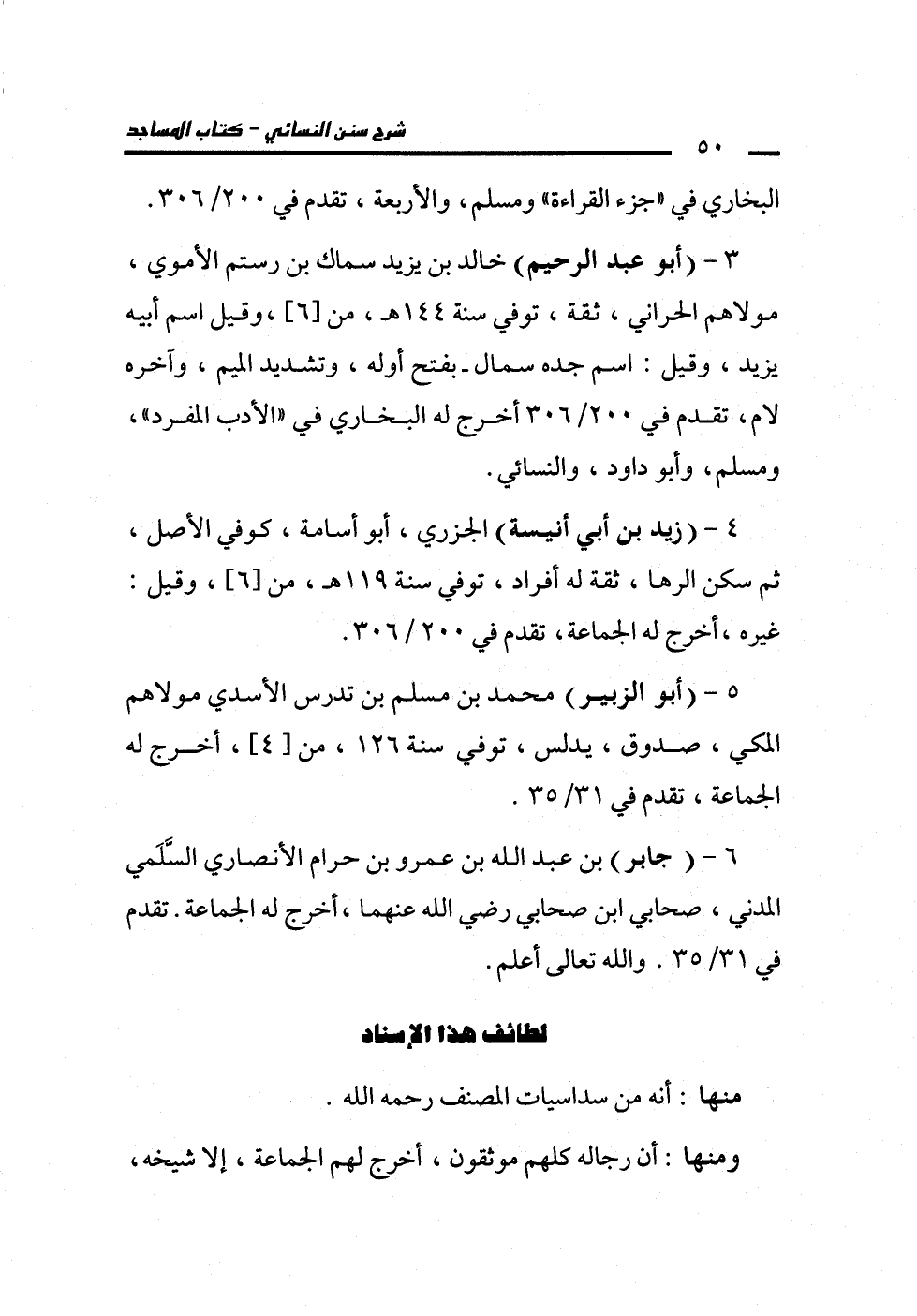 3 - (أبو عبد الرحيم) خالد بن يزيد سماك بن رستم الأموي، مولاهم الحراني، ثقة، توفي سنة 144 هـ، من [6]، وقيل اسم أبيه يزيد، وقيل: اسم جده سمال -بفتح أوله، وتشديد الميم، وآخره لام، تقدم في 200/ 306 أخرج له البخاري في "الأدب المفرد"، ومسلم، وأبو داود، والنسائي.