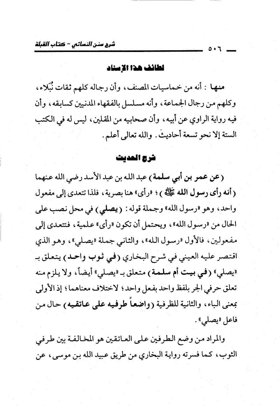 (عن عمر بن أبي سلمة) عبد الله بن عبد الأسد رضي الله عنهما (أنه رأى رسول الله -صلى الله عليه وسلم-)؛ "رأى" هنا بصرية، فلذا تتعدى إلى مفعول واحد، وهو "رسول الله" وجملة قوله: (يصلي) في محل نصب على الحال من "رسول الله"، ويحتمل أن تكون "رأى" علمية، فتتعدى إلى مفعولين، فالأول "رسول الله"، والثاني جملة "يصلي"، وهو الذي اقتصر عليه العيني في شرح البخاري (في ثوب واحد) يتعلق بـ "يصلي" (في بيت أم سلمة) متعلق بـ "يصلي" أيضاً، ولا يلزم منه تعلق حرفي الجر بلفظ واحد بفعل واحد؛ لاختلاف معناهما؛ إذ الأولى بمعنى الباء، والثانية للظرفية (واضعاً طرفيه على عاتقيه) حال من فاعل "يصلي".