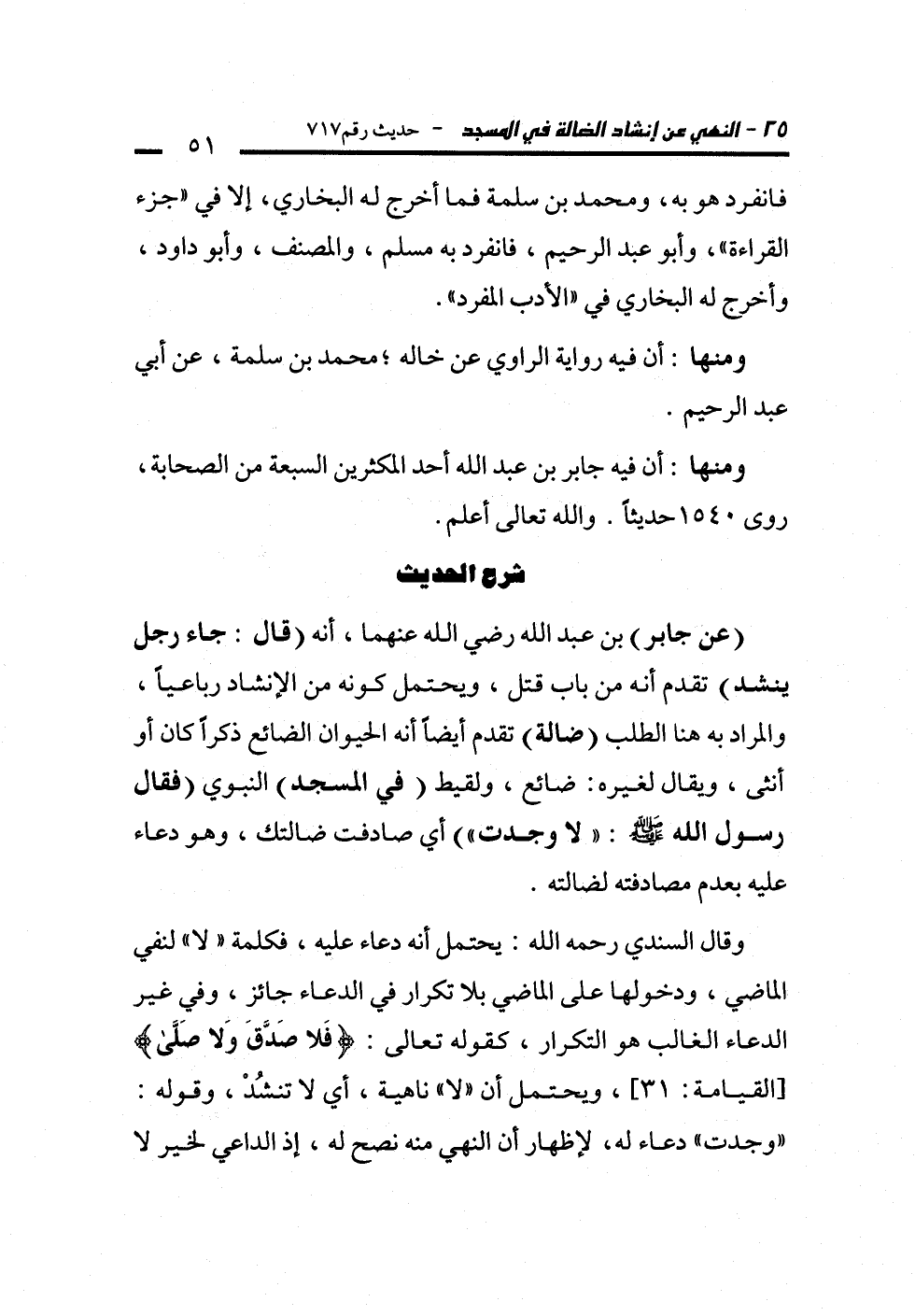 (عن جابر) بن عبد الله رضي الله عنهما، أنه (قال: جاء رجل ينشد) تقدم أنه من باب قتل، ويحتمل كونه من الإسناد رباعيًا، والمراد به هنا الطلب (ضالة) تقدم أيضًا أنه الحيوان الضائع ذكرًا كان أو أنثى، ويقال لغيره: ضائع، ولقيط (في المسجد) النبوي (فقال رسول الله -صلى الله عليه وسلم-: "لا وجدت") أي صادفت ضالتك، وهو دعاء عليه بعدم مصادفته لضالته.