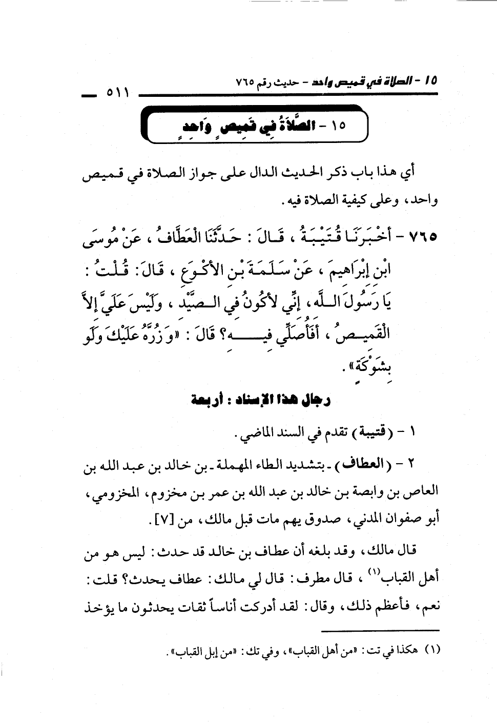 765 - أَخْبَرَنَا قُتَيْبَةُ، قَالَ: حَدَّثَنَا الْعَطَّافُ، عَنْ مُوسَى بْنِ إِبْرَاهِيمَ، عَنْ سَلَمَةَ بْنِ الأَكْوَعِ، قَالَ: قُلْتُ: يَا رَسُولَ اللَّهِ، إِنِّي لأَكُونُ فِي الصَّيْدِ، وَلَيْسَ عَلَيَّ إِلاَّ الْقَمِيصُ، أَفَأُصَلِّي فِيهِ؟ قَالَ: "وَزُرَّهُ عَلَيْكَ وَلَوْ بِشَوْكَةٍ".