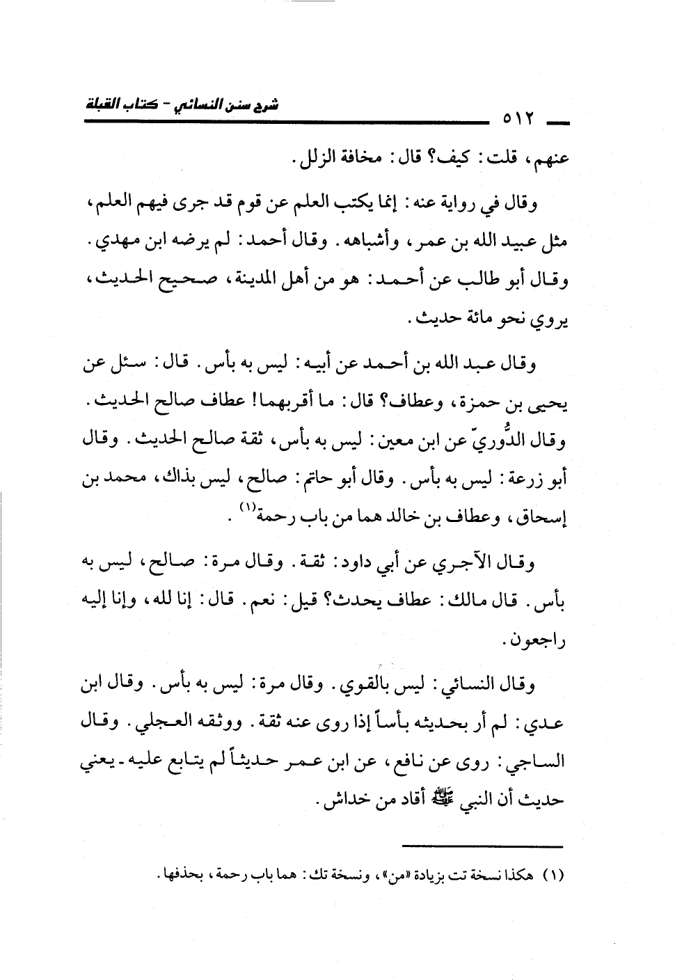 وقال عبد الله بن أحمد عن أبيه: ليس به بأس. قال: سئل عن يحيى بن حمزة، وعطاف؟ قال: ما أقربهما! عطاف صالح الحديث. وقال الدُّوريّ عن ابن معين: ليس به بأس، ثقة صالح الحديث. وقال أبو زرعة: ليس به بأس. وقال أبو حاتم: صالح، ليس بذاك، محمد بن إسحاق، وعطاف بن خالد هما من باب رحمة (¬1).