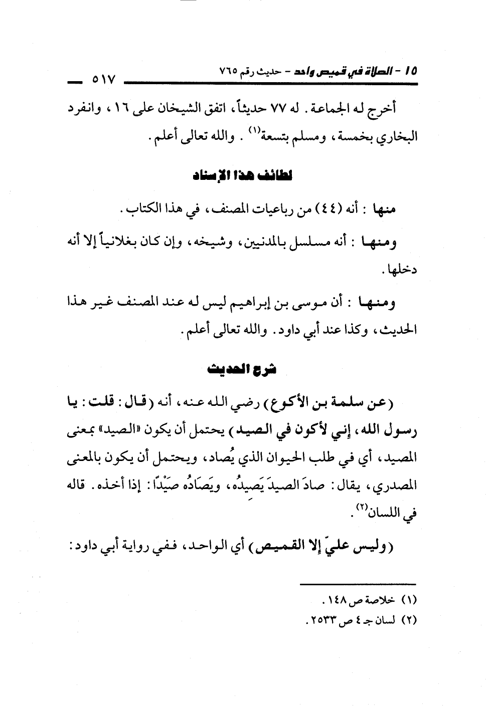 (عن سلمة بن الأكوع) رضي الله عنه، أنه (قال: قلت: يا رسول الله، إِني لأكون في الصيد) يحتمل أن يكون "الصيد" بمعنى المصيد، أي في طلب الحيوان الذي يُصاد، ويحتمل أن يكون بالمعنى المصدري، يقال: صادَ الصيدَ يَصِيدُه، ويَصَادُه صَيْدًا: إذا أخذه. قاله في اللسان (¬2).