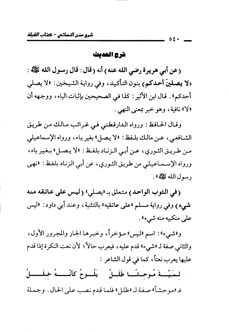 (عن أبي هريرة رضي الله عنه) أنه (قال: قال رسول الله -صلى الله عليه وسلم-: "لا يصلينّ أحدكم) بنون التأكيد، وفي رواية الشيخين: "لا يصلي أحدكم". قال ابن الأثير: كذا في الصحيحين بإثبات الياء، ووجهه أن "لا" نافية، وهو خبر بمعنى النهي.