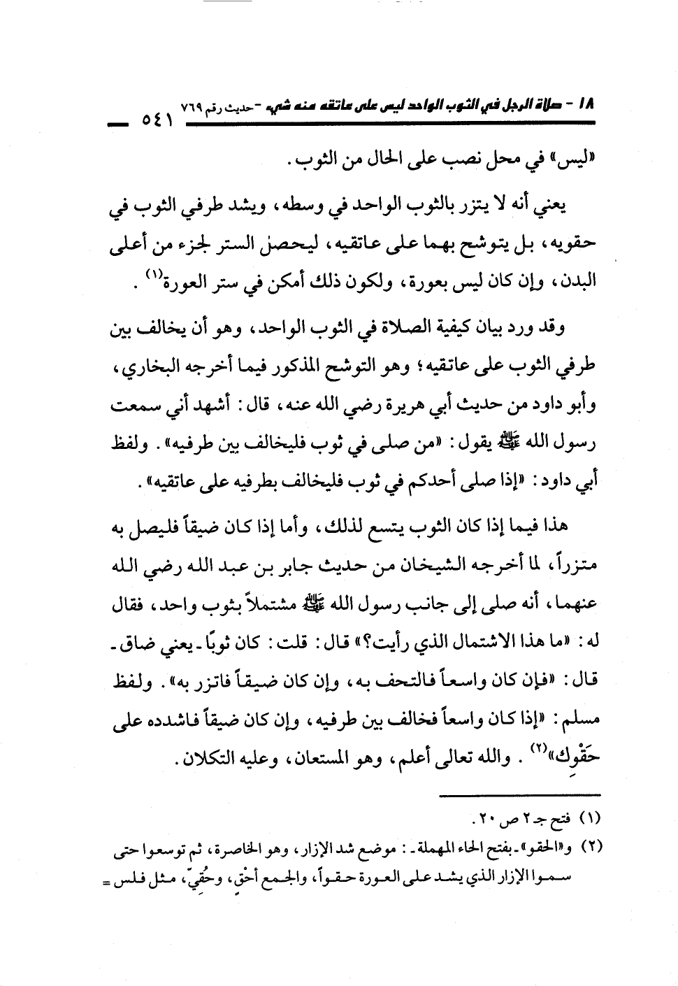 هذا فيما إذا كان الثوب يتسع لذلك، وأما إذا كان ضيقاً فليصل به متزراً، لما أخرجه الشيخان من حديث جابر بن عبد الله رضي الله عنهما، أنه صلى إلى جانب رسول الله -صلى الله عليه وسلم- مشتملاً بثوب واحد، فقال له: "ما هذا الاشتمال الذي رأيت؟ " قال: قلت: كان ثوبًا -يعني ضاق- قال: "فإن كان واسعاً فالتحف به، وإن كان ضيقاً فاتزر به". ولفظ مسلم: "إذا كان واسعاً فخالف بين طرفيه، وإن كان ضيقاً فاشدده على حَقْوِك" (¬2). والله تعالى أعلم، وهو المستعان، وعليه التكلان.