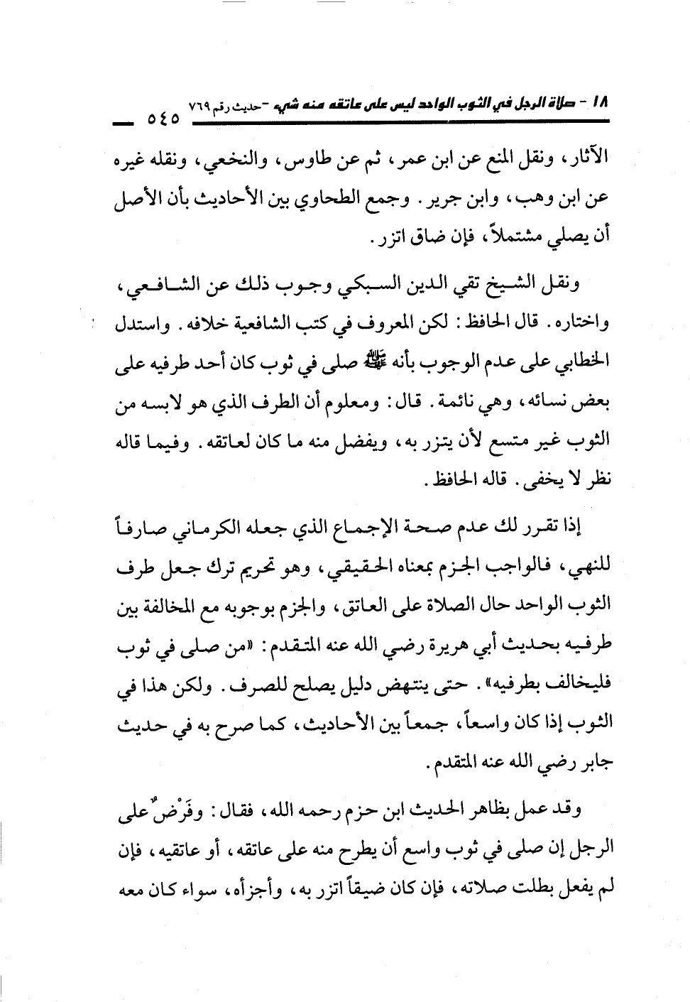 ونقل الشيخ تقي الدين السبكي وجوب ذلك عن الشافعي، واختاره. قال الحافظ: لكن المعروف في كتب الشافعية خلافه. واستدل الخطابي على عدم الوجوب بأنه -صلى الله عليه وسلم- صلى في ثوب كان أحد طرفيه على بعض نسائه، وهي نائمة. قال: ومعلوم أن الطرف الذي هو لابسه من الثوب غير متسع لأن يتزر به، ويفضل منه ما كان لعاتقه. وفيما قاله نظر لا يخفى. قاله الحافظ.