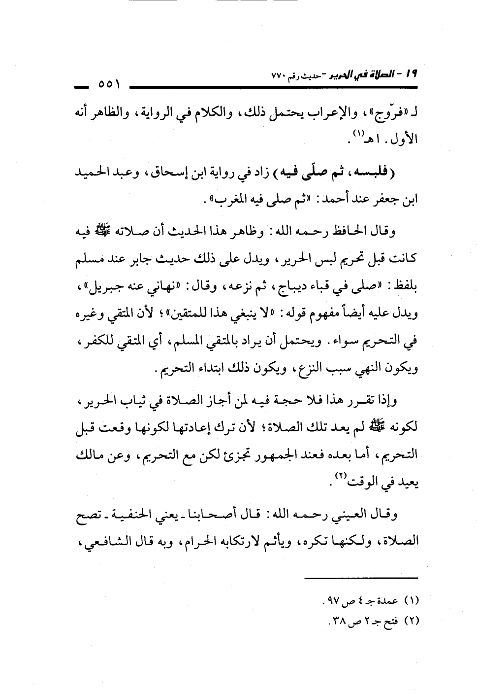 وإذا تقرر هذا فلا حجة فيه لمن أجاز الصلاة في ثياب الحرير، لكونه -صلى الله عليه وسلم- لم يعد تلك الصلاة؛ لأن ترك إعادتها لكونها وقعت قبل التحريم، أما بعده فعند الجمهور تجزىء لكن مع التحريم، وعن مالك يعيد في الوقت (¬2).