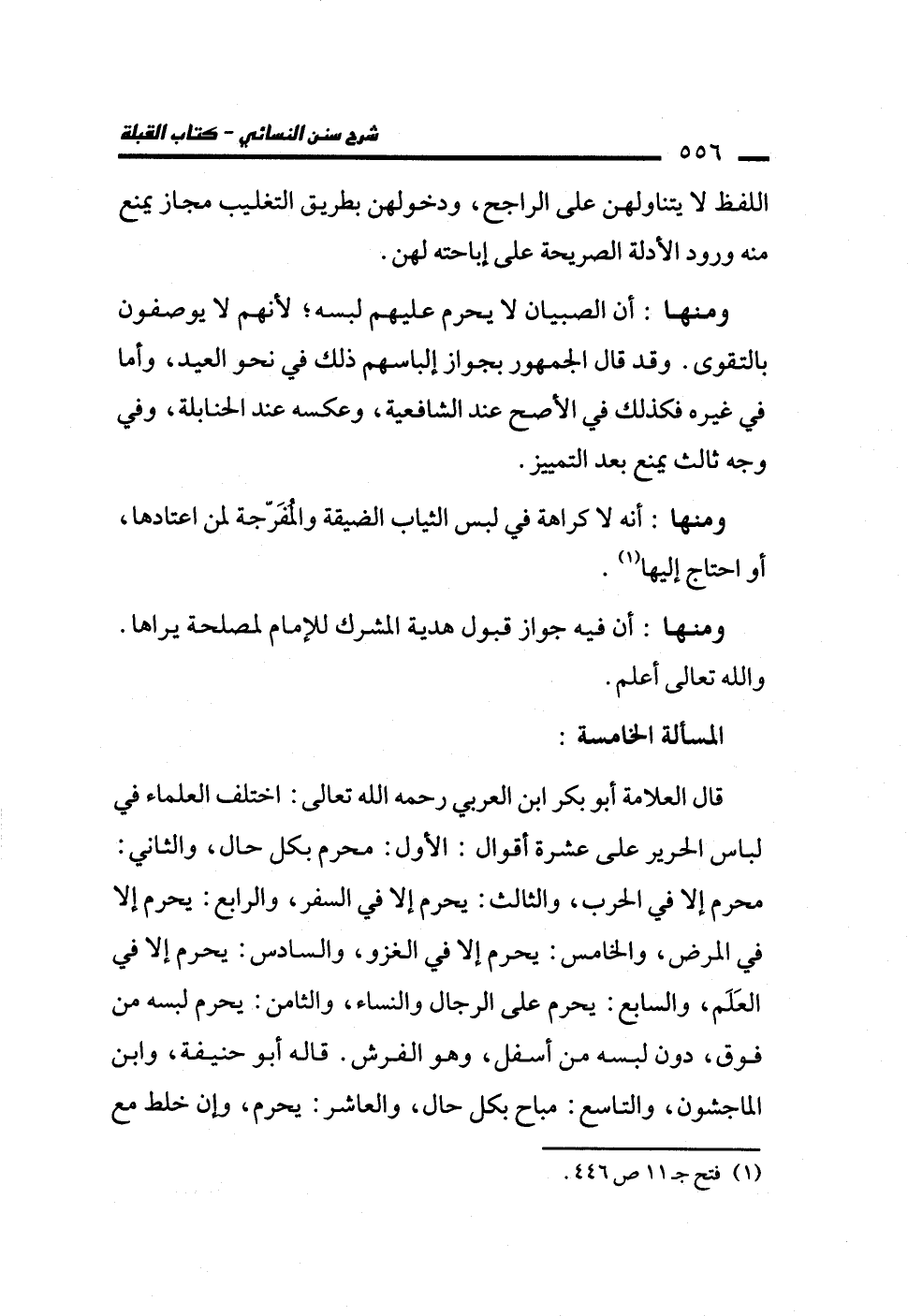 ومنها: أن الصبيان لا يحرم عليهم لبسه؛ لأنهم لا يوصفون بالتقوى. وقد قال الجمهور بجواز إلباسهم ذلك في نحو العيد، وأما في غيره فكذلك في الأصح عند الشافعية، وعكسه عند الحنابلة، وفي وجه ثالث يمنع بعد التمييز.