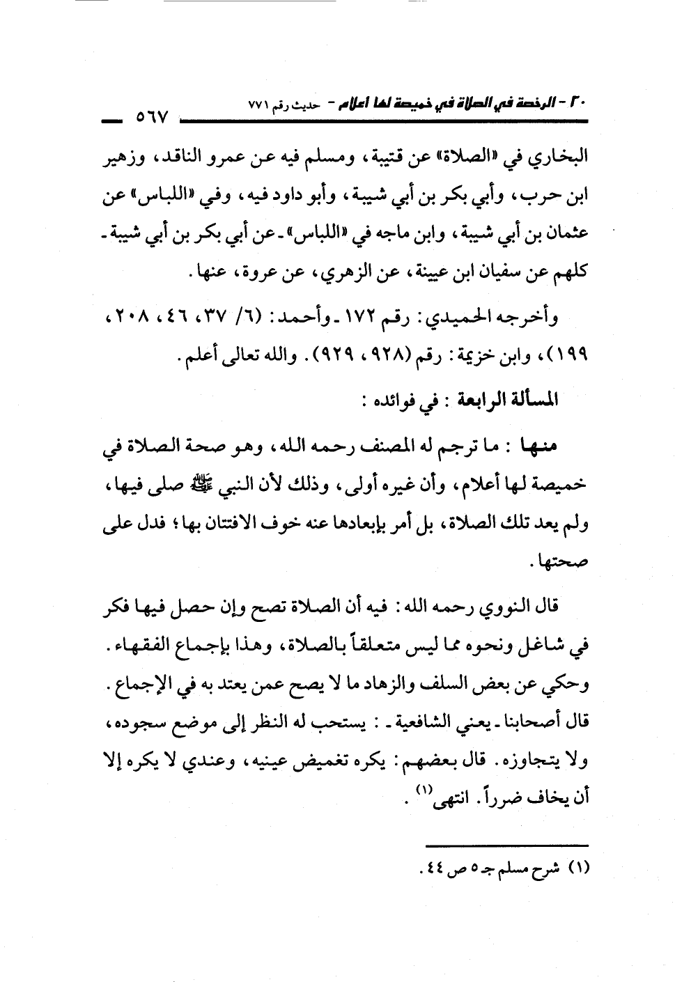 البخاري في "الصلاة" عن قتيبة، ومسلم فيه عن عمرو الناقد، وزهير ابن حرب، وأبي بكر بن أبي شيبة، وأبو داود فيه، وفي "اللباس" عن عثمان بن أبي شيبة، وابن ماجه في "اللباس" -عن أبي بكر بن أبي شيبة- كلهم عن سفيان ابن عيينة، عن الزهري، عن عروة، عنها.