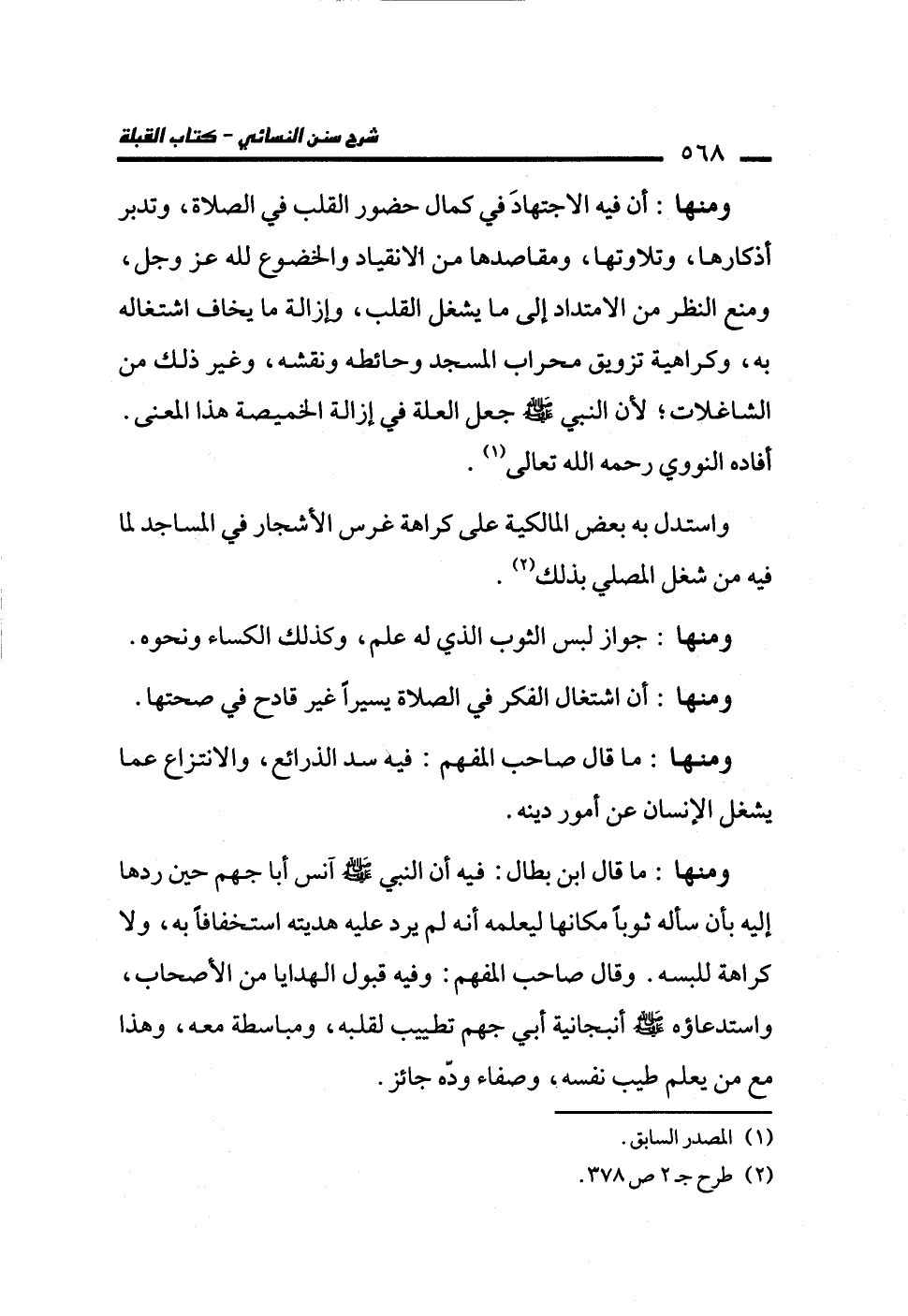 ومنها: أن فيه الاجتهادَ في كمال حضور القلب في الصلاة، وتدبر أذكارها، وتلاوتها، ومقاصدها من الانقياد والخضوع لله عز وجل، ومنع النظر من الامتداد إلى ما يشغل القلب، وإزالة ما يخاف اشتغاله به، وكراهية تزويق محراب المسجد وحائطه ونقشه، وغير ذلك من الشاغلات؛ لأن النبي -صلى الله عليه وسلم- جعل العلة في إزالة الخميصة هذا المعنى. أفاده النووي رحمه الله تعالى (¬1).