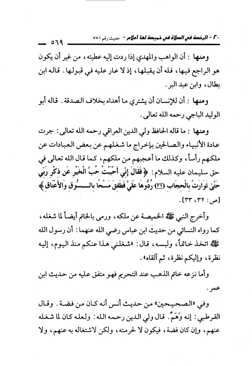 ومنها: ما قاله الحافظ ولي الدين العراقي رحمه الله تعالى: جرت عادة الأنبياء والصالحين بإخراج ما شغلهم عن بعض العبادات عن ملكهم رأساً، وكذلك ما أعجبهم من ملكهم، كما قال الله تعالى في حق سليمان عليه السلام: {فَقَالَ إِنِّي أَحْبَبْتُ حُبَّ الْخَيْرِ عَنْ ذِكْرِ رَبِّي حَتَّى تَوَارَتْ بِالْحِجَابِ (32) رُدُّوهَا عَلَيَّ فَطَفِقَ مَسْحًا بِالسُّوقِ وَالْأَعْنَاقِ} [ص: 32، 33].