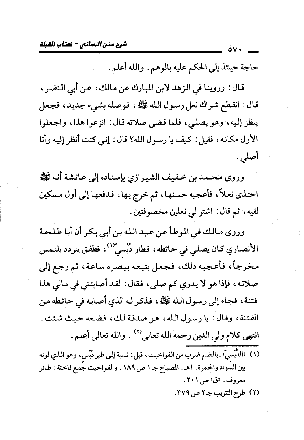 وروى مالك في الموطأ عن عبد الله بن أبي بكر أن أبا طلحة الأنصاري كان يصلي في حائطه، فطار دُبْسِيّ (¬1)، فطفق يتردد يلتمس مخرجاً، فأعجبه ذلك، فجعل يتبعه ببصره ساعة، ثم رجع إلى صلاته، فإذا هو لا يدري كم صلى، فقال: لقد أصابتني في مالي هذا فتنة، فجاء إلى رسول الله -صلى الله عليه وسلم-، فذكر له الذي أصابه في حائطه من الفتنة، وقال: يا رسول الله، هو صدقة لك، فضعه حيث شئت. انتهى كلام ولي الدين رحمه الله تعالى (¬2). والله تعالى أعلم.