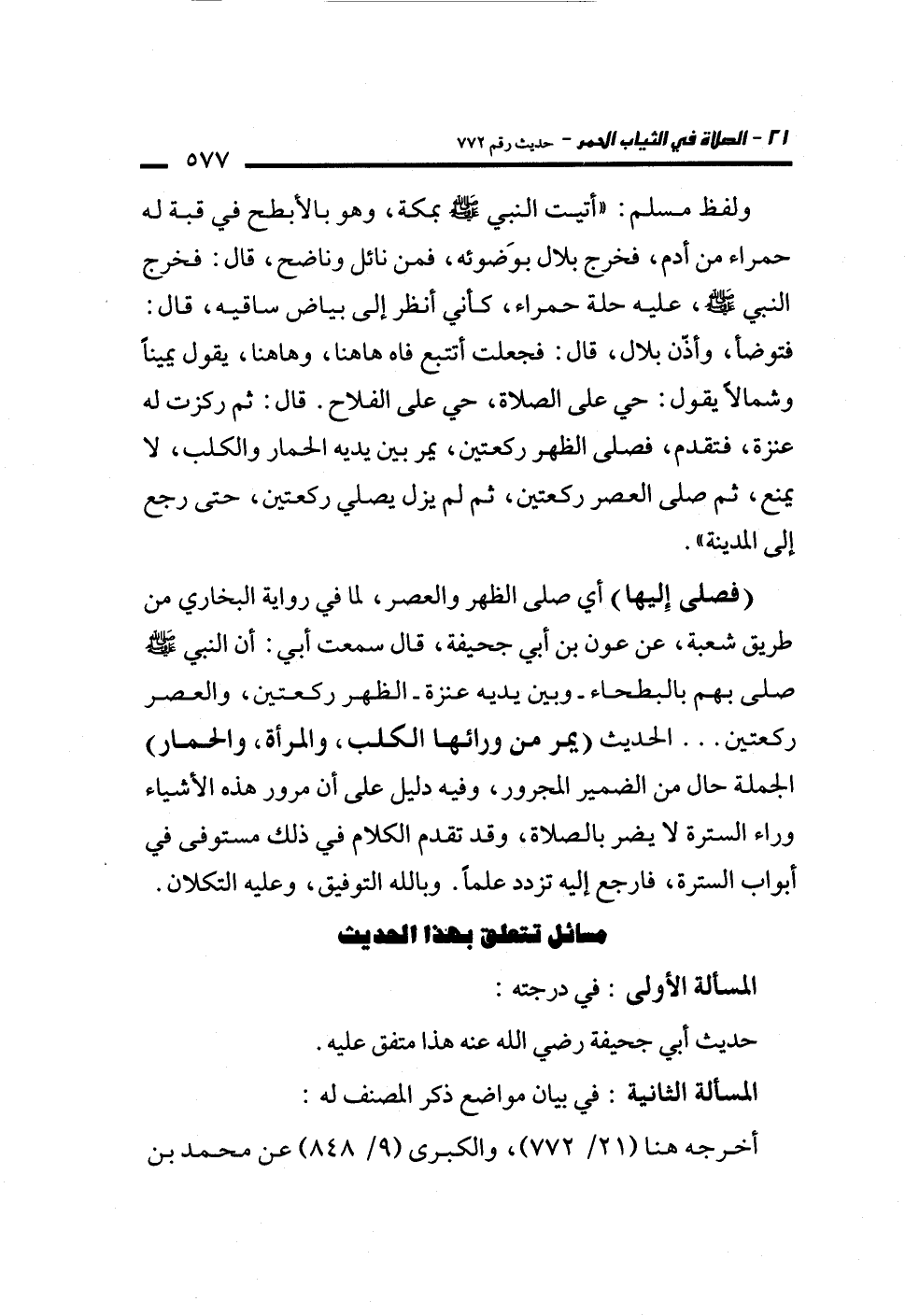 ولفظ مسلم: "أتيت النبي -صلى الله عليه وسلم- بمكة، وهو بالأبطح في قبة له حمراء من أدم، فخرج بلال بوَضوئه، فمن نائل وناضح، قال: فخرج النبي -صلى الله عليه وسلم-، عليه حلة حمراء، كأني أنظر إلى بياض ساقيه، قال: فتوضأ، وأذّن بلال، قال: فجعلت أتتبع فاه هاهنا، وهاهنا، يقول يميناً وشمالاً يقول: حي على الصلاة، حي على الفلاح. قال: ثم ركزت له عنزة، فتقدم، فصلى الظهر ركعتين، يمر بين يديه الحمار والكلب، لا يمنع، ثم صلى العصر ركعتين، ثم لم يزل يصلي ركعتين، حتى رجع إلى المدينة".