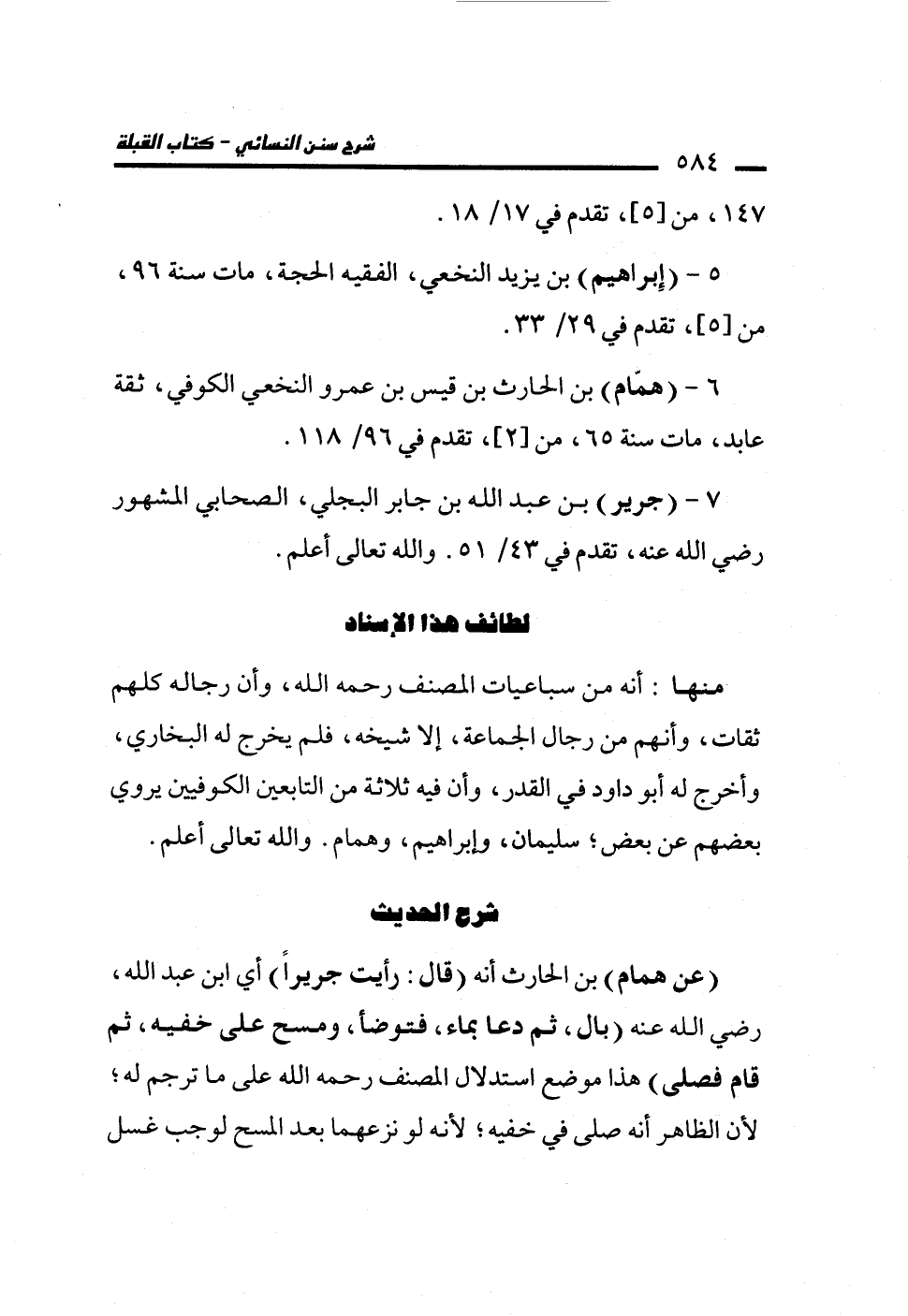 (عن همام) بن الحارث أنه (قال: رأيت جريراً) أي ابن عبد الله، رضي الله عنه (بال، ثم دعا بماء، فتوضأ، ومسح على خفيه، ثم قام فصلى) هذا موضع استدلال المصنف رحمه الله على ما ترجم له؛ لأن الظاهر أنه صلى في خفيه؛ لأنه لو نزعهما بعد المسح لوجب غسل