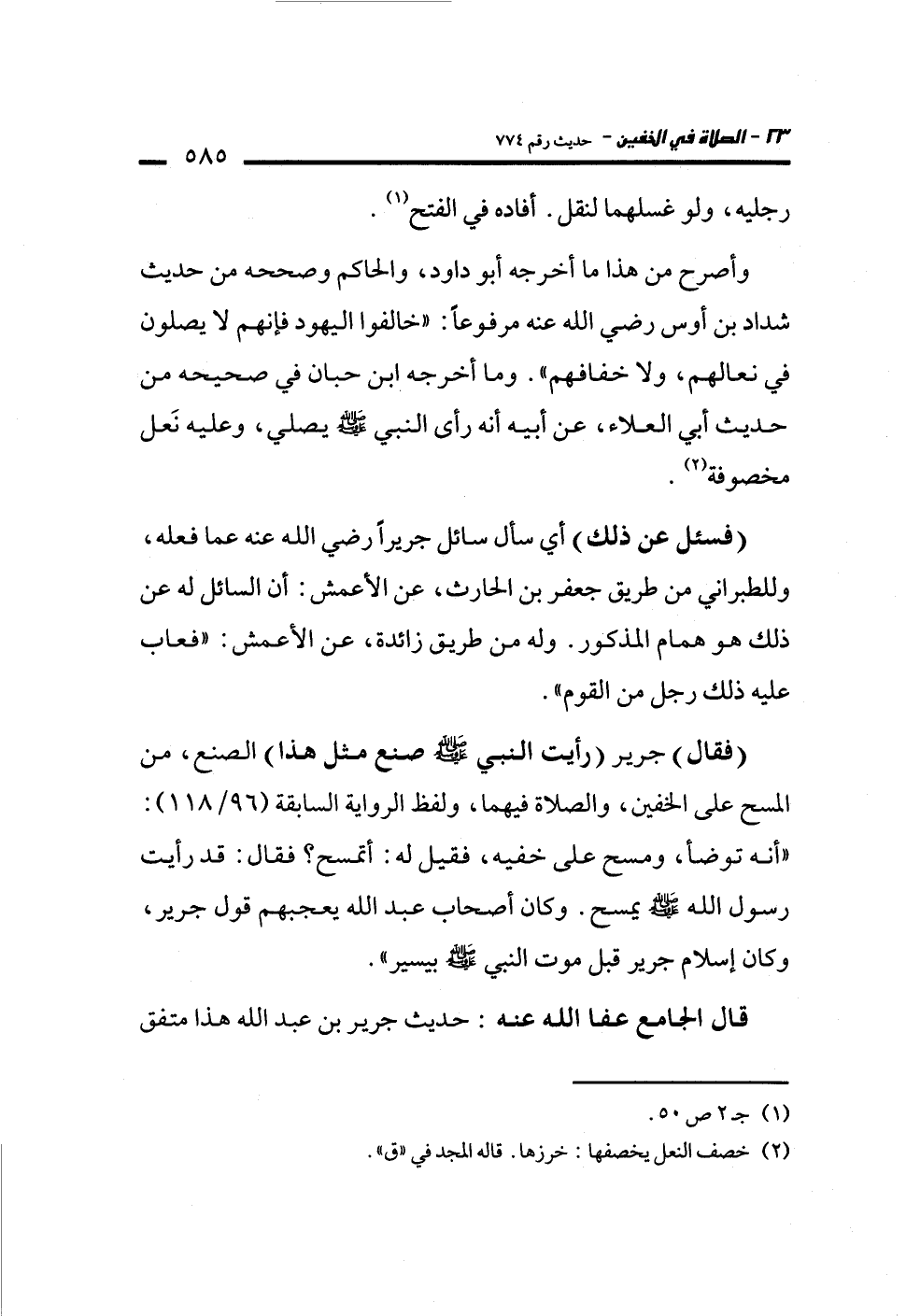 وأصرح من هذا ما أخرجه أبو داود، والحاكم وصححه من حديث شداد بن أوس رضي الله عنه مرفوعاً: "خالفوا اليهود فإنهم لا يصلون في نعالهم، ولا خفافهم". وما أخرجه ابن حبان في صحيحه من حديث أبي العلاء، عن أبيه أنه رأى النبي -صلى الله عليه وسلم- يصلي، وعليه نَعل مخصوفة (¬2).