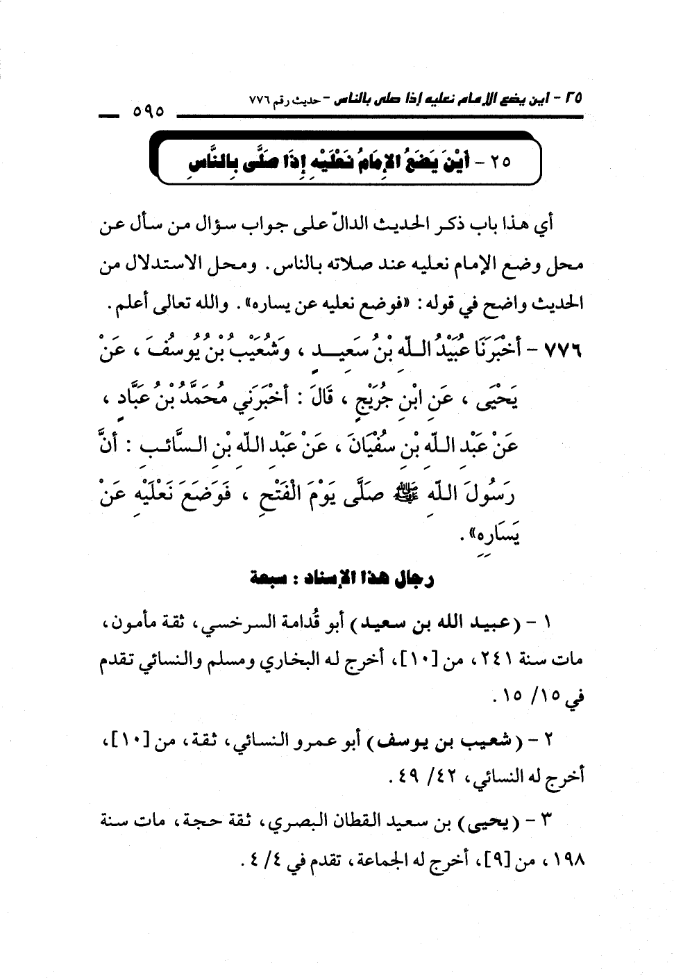 776 - أَخْبَرَنَا عُبَيْدُ اللَّهِ بْنُ سَعِيدٍ، وَشُعَيْبُ بْنُ يُوسُفَ، عَنْ يَحْيَى، عَنِ ابْنِ جُرَيْجٍ، قَالَ: أَخْبَرَنِي مُحَمَّدُ بْنُ عَبَّادٍ، عَنْ عَبْدِ اللَّهِ بْنِ سُفْيَانَ، عَنْ عَبْدِ اللَّهِ بْنِ السَّائِبِ: أَنَّ رَسُولَ اللَّهِ -صلى الله عليه وسلم- صَلَّى يَوْمَ الْفَتْحِ، فَوَضَعَ نَعْلَيْهِ عَنْ يَسَارِهِ.
