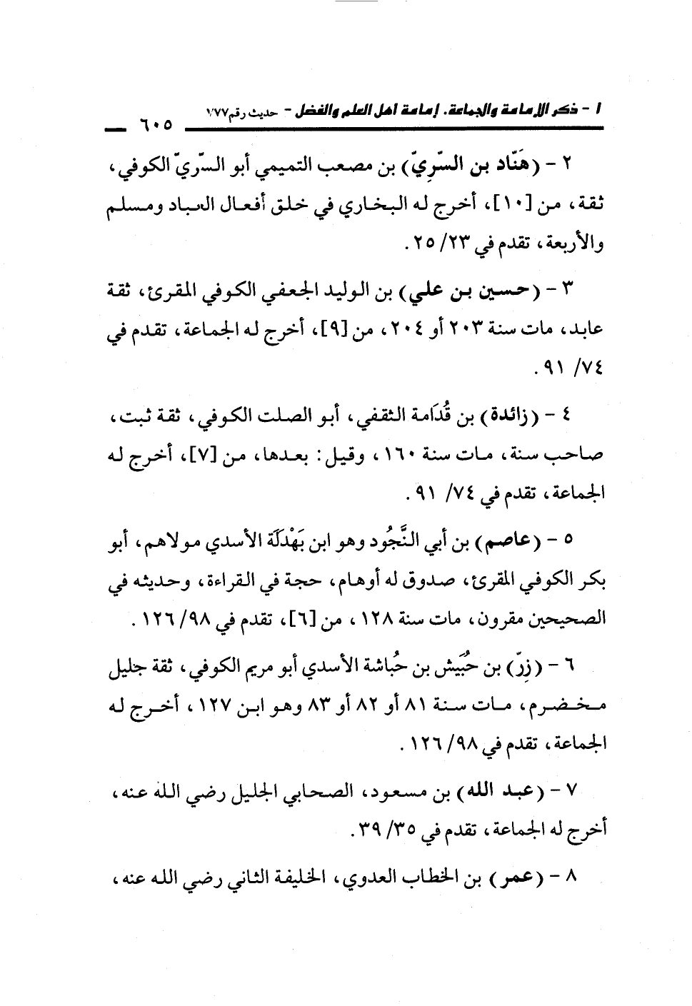 4 - (زائدة) بن قُدَامة الثقفي، أبو الصلت الكوفي، ثقة ثبت، صاحب سنة، مات سنة 160، وقيل: بعدها، من [7]، أخرج له الجماعة، تقدم في 74/ 91.