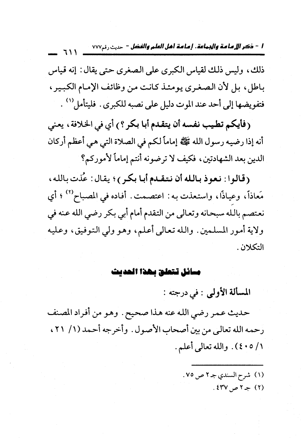 (قالوا: نعوذ بالله أن نتقدم أبا بكر)؛ يقال: عُذت بالله، مَعاذاً، وعِياذًا، واستعذت به: اعتصمت. أفاده في المصباح (¬2)؛ أي نعتصم بالله سبحانه وتعالى من التقدم أمام أبي بكر رضي الله عنه في ولاية أمور المسلمين. والله تعالى أعلم، وهو ولي التوفيق، وعليه التكلان.