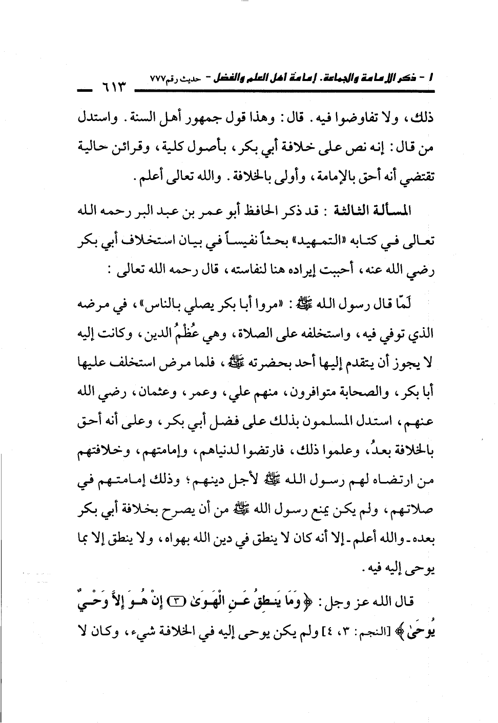 المسألة الثالثة: قد ذكر الحافظ أبو عمر بن عبد البر رحمه الله تعالى في كتابه "التمهيد" بحثاً نفيساً في بيان استخلاف أبي بكر رضي الله عنه، أحببت إيراده هنا لنفاسته، قال رحمه الله تعالى: