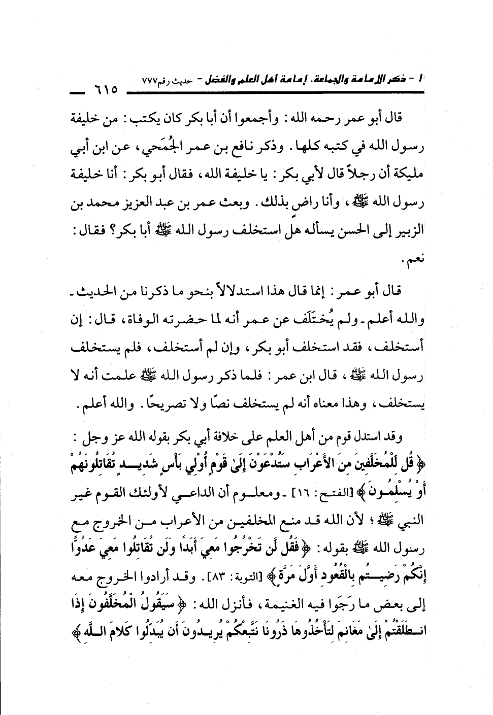 وقد استدل قوم من أهل العلم على خلافة أبي بكر بقوله الله عز وجل: {قُلْ لِلْمُخَلَّفِينَ مِنَ الْأَعْرَابِ سَتُدْعَوْنَ إِلَى قَوْمٍ أُولِي بَأْسٍ شَدِيدٍ تُقَاتِلُونَهُمْ أَوْ يُسْلِمُونَ} [الفتح: 16]-ومعلوم أن الداعي لأولئك القوم غير النبي -صلى الله عليه وسلم-؛ لأن الله قد منع المخلفين من الأعراب من الخروج مع رسول الله -صلى الله عليه وسلم- بقوله: {فَقُلْ لَنْ تَخْرُجُوا مَعِيَ أَبَدًا وَلَنْ تُقَاتِلُوا مَعِيَ عَدُوًّا إِنَّكُمْ رَضِيتُمْ بِالْقُعُودِ أَوَّلَ مَرَّةٍ} [التوبة: 83]. وقد أرادوا الخروج معه إلى بعض ما رَجَوا فيه الغنيمة، فأنزل الله: {سَيَقُولُ الْمُخَلَّفُونَ إِذَا انْطَلَقْتُمْ إِلَى مَغَانِمَ لِتَأْخُذُوهَا ذَرُونَا نَتَّبِعْكُمْ يُرِيدُونَ أَنْ يُبَدِّلُوا كَلَامَ اللَّهِ}