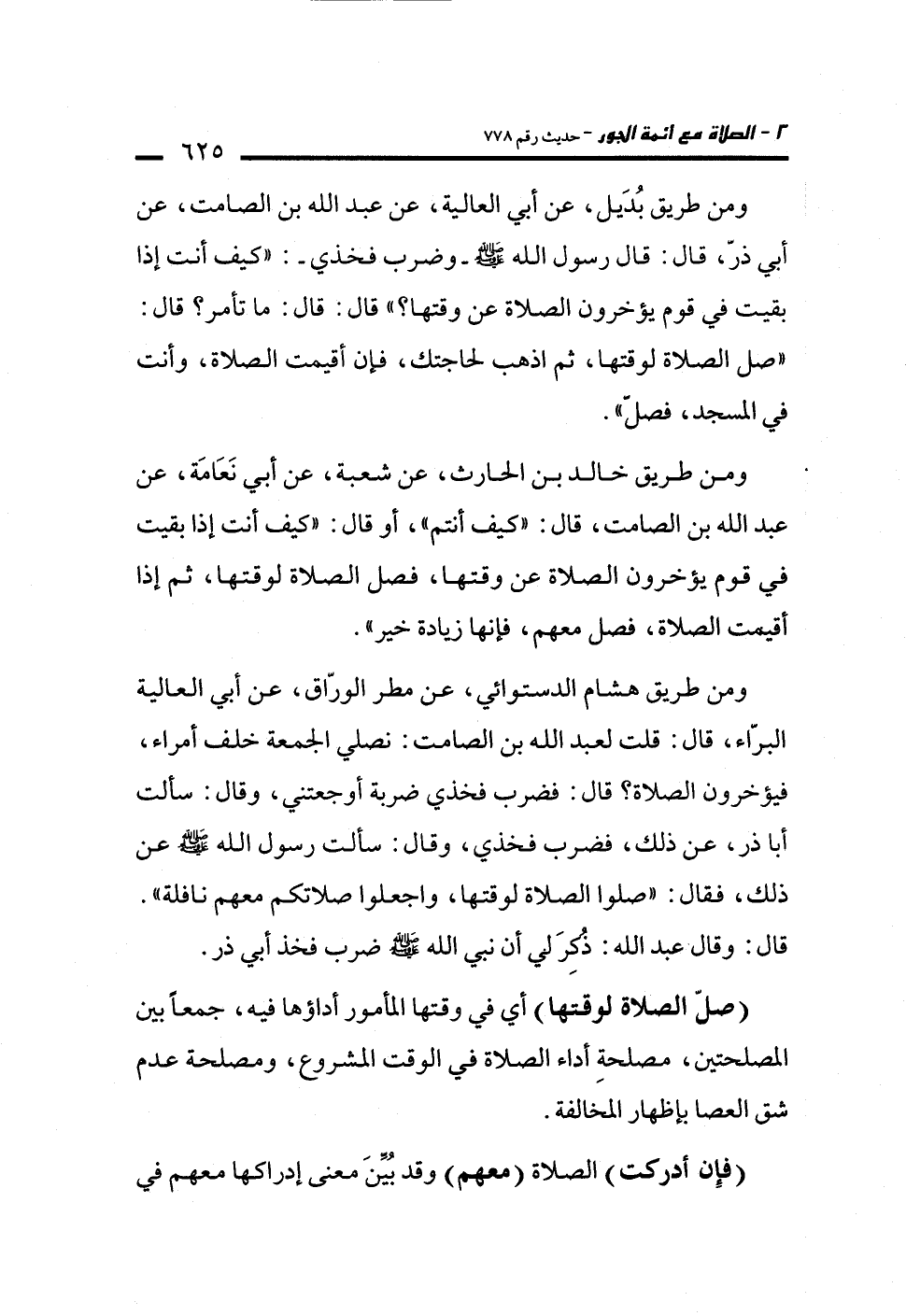 ومن طريق هشام الدستوائي، عن مطر الورّاق، عن أبي العالية البرّاء، قال: قلت لعبد الله بن الصامت: نصلي الجمعة خلف أمراء، فيؤخرون الصلاة؟ قال: فضرب فخذي ضربة أوجعتني، وقال: سألت أبا ذر، عن ذلك، فضرب فخذي، وقال: سألت رسول الله -صلى الله عليه وسلم- عن ذلك، فقال: "صلوا الصلاة لوقتها، واجعلوا صلاتكم معهم نافلة". قال: وقال عبد الله: ذُكِرَ لي أن نبي الله -صلى الله عليه وسلم- ضرب فخذ أبي ذر.
