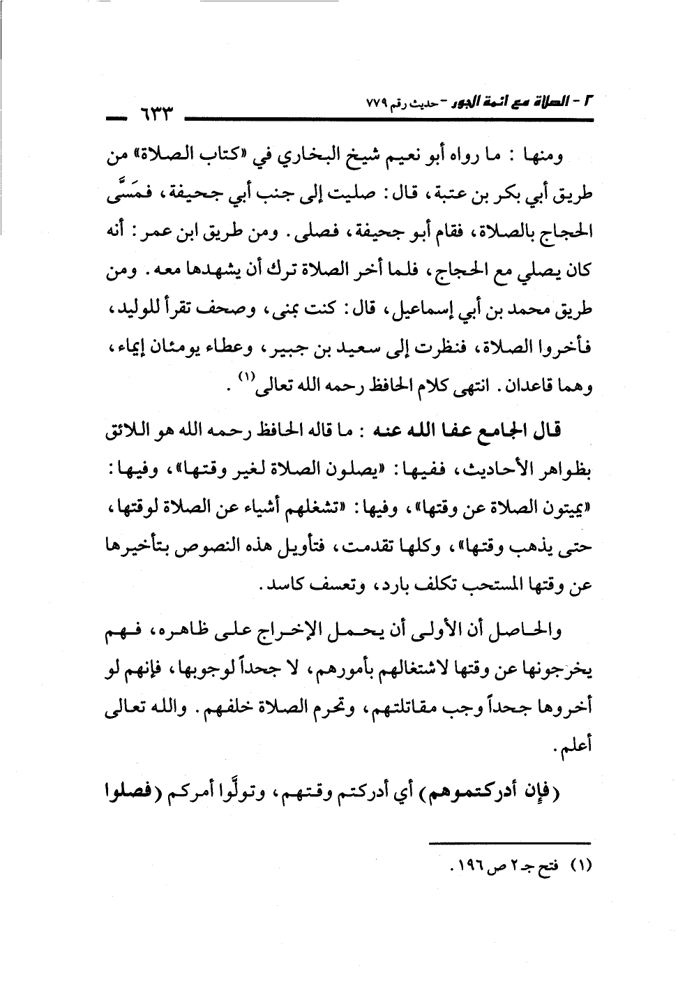 ومنها: ما رواه أبو نعيم شيخ البخاري في "كتاب الصلاة" من طريق أبي بكر بن عتبة، قال: صليت إلى جنب أبي جحيفة، فمَسَّى الحجاج بالصلاة، فقام أبو جحيفة، فصلى. ومن طريق ابن عمر: أنه كان يصلي مع الحجاج، فلما أخر الصلاة ترك أن يشهدها معه. ومن طريق محمد بن أبي إسماعيل، قال: كنت بمنى، وصحف تقرأ للوليد، فأخروا الصلاة، فنظرت إلى سعيد بن جبير، وعطاء يومئان إيماء، وهما قاعدان. انتهى كلام الحافظ رحمه الله تعالى (¬1).