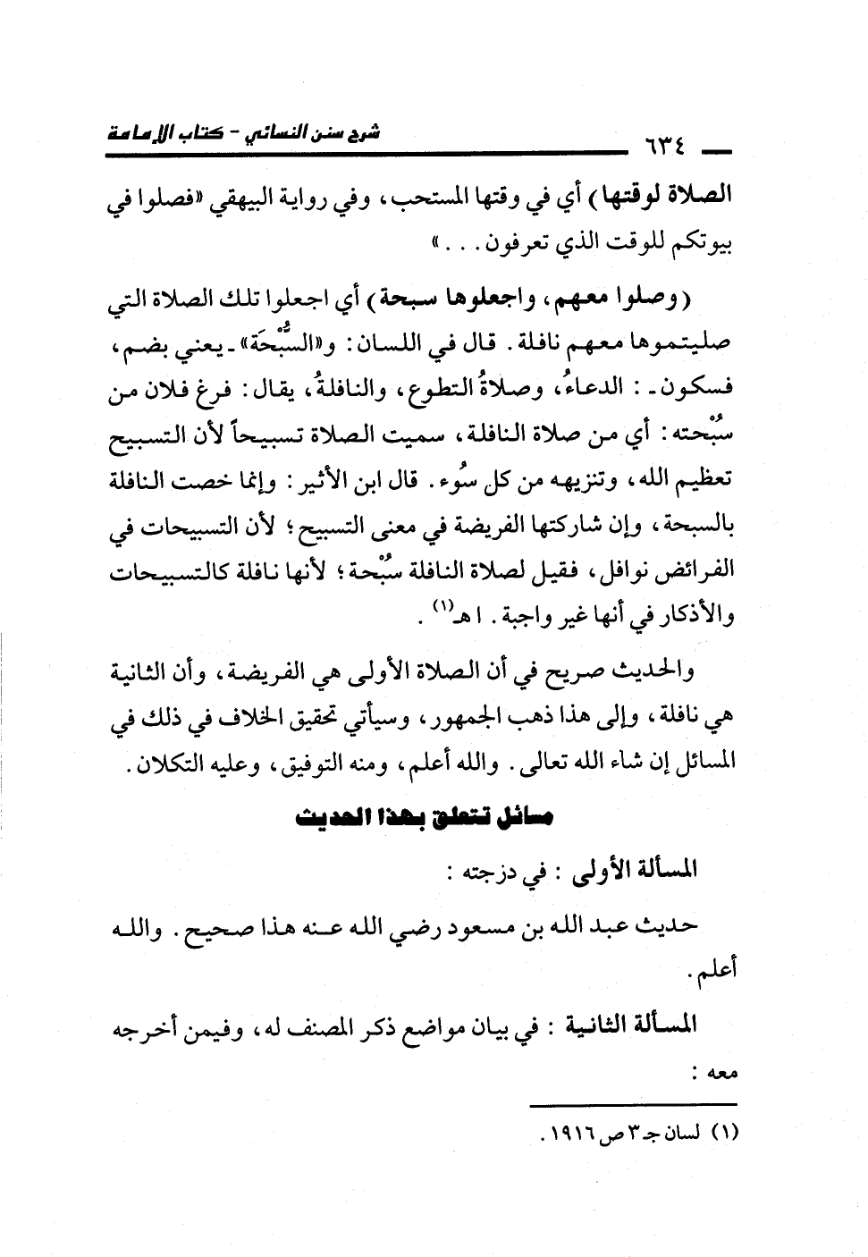 (وصلوا معهم، واجعلوها سبحة) أي اجعلوا تلك الصلاة التي صليتموها معهم نافلة. قال في اللسان: و"السُّبْحَة" -يعني بضم، فسكون-: الدعاءُ، وصلاةُ التطوع، والنافلةُ، يقال: فرغ فلان من سُبْحته: أي من صلاة النافلة، سميت الصلاة تسبيحاً لأن التسبيح تعظيم الله، وتنزيهه من كل سُوء. قال ابن الأثير: وإنما خصت النافلة بالسبحة، وإن شاركتها الفريضة في معنى التسبيح؛ لأن التسبيحات في الفرائض نوافل، فقيل لصلاة النافلة سُبْحة؛ لأنها نافلة كالتسبيحات والأذكار في أنها غير واجبة. اهـ (¬1).
