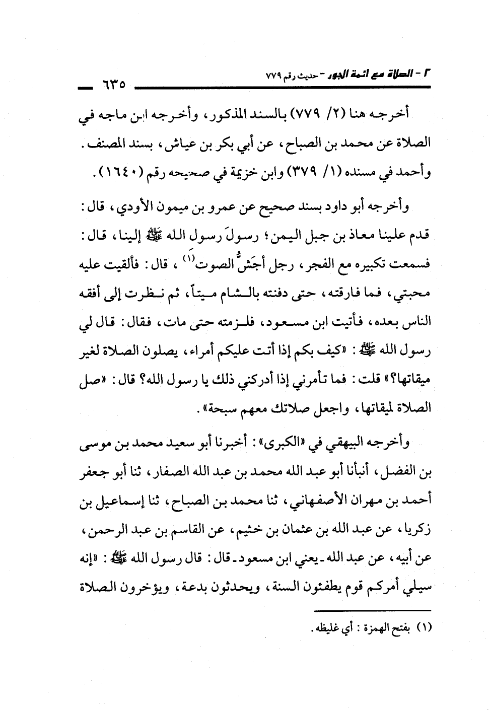 وأخرجه أبو داود بسند صحيح عن عمرو بن ميمون الأودي، قال: قدم علينا معاذ بن جبل اليمن؛ رسولَ رسول الله -صلى الله عليه وسلم- إلينا، قال: فسمعت تكبيره مع الفجر، رجل أجَشُّ الصوت (¬1)، قال: فألقيت عليه محبتي، فما فارقته، حتى دفنته بالشام ميتاً، ثم نظرت إلى أفقه الناس بعده، فأتيت ابن مسعود، فلزمته حتى مات، فقال: قال لي رسول الله -صلى الله عليه وسلم-: "كيف بكم إذا أتت عليكم أمراء، يصلون الصلاة لغير ميقاتها؟ " قلت: فما تأمرني إذا أدركني ذلك يا رسول الله؟ قال: "صل الصلاة لميقاتها، واجعل صلاتك معهم سبحة".