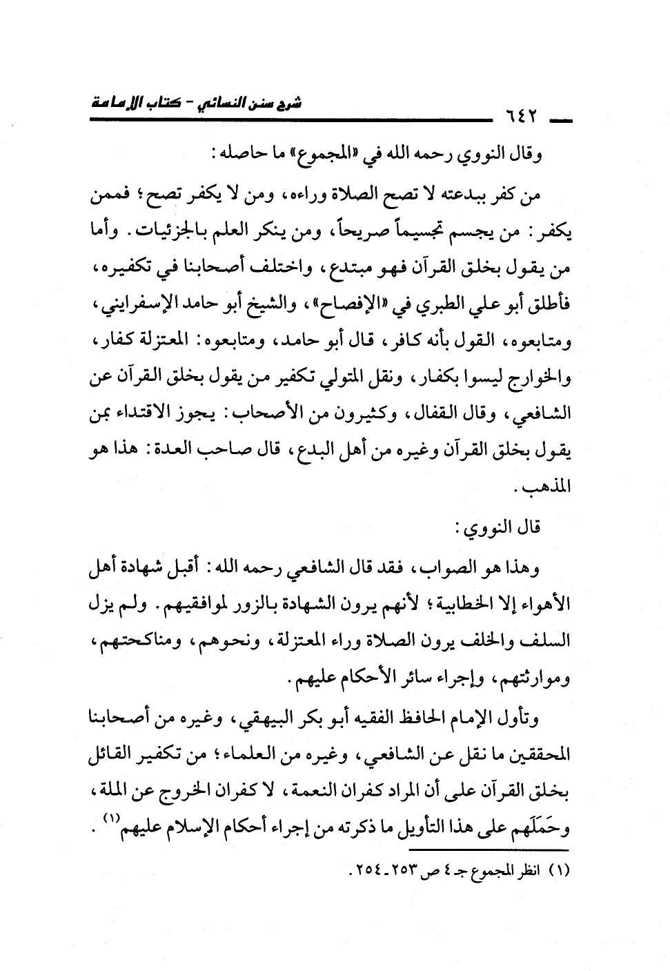 وتأول الإمام الحافظ الفقيه أبو بكر البيهقي، وغيره من أصحابنا المحققين ما نقل عن الشافعي، وغيره من العلماء؛ من تكفير القائل بخلق القرآن على أن المراد كفران النعمة، لا كفران الخروج عن الملة، وحَمَلَهم على هذا التأويل ما ذكرته من إجراء أحكام الإسلام عليهم (¬1).