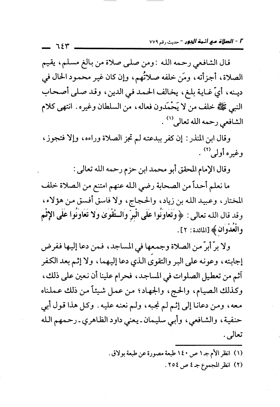 ولا برّ أبرّ من الصلاة وجمعها في المساجد، فمن دعا إليها ففرض إجابته، وعونه على البر والتقوى الذي دعا إليهما، ولا إثم بعد الكفر آثم من تعطيل الصلوات في المساجد، فحرام علينا أن نعين على ذلك، وكذلك الصيام، والحج، والجهاد؛ من عمل شيئاً من ذلك عملناه معه، ومن دعانا إلى إثم لم نجبه، ولم نعنه عليه. وكل هذا قول أبي حنفية، والشافعي، وأبي سليمان -يعني داود الظاهري- رحمهم الله تعالى.