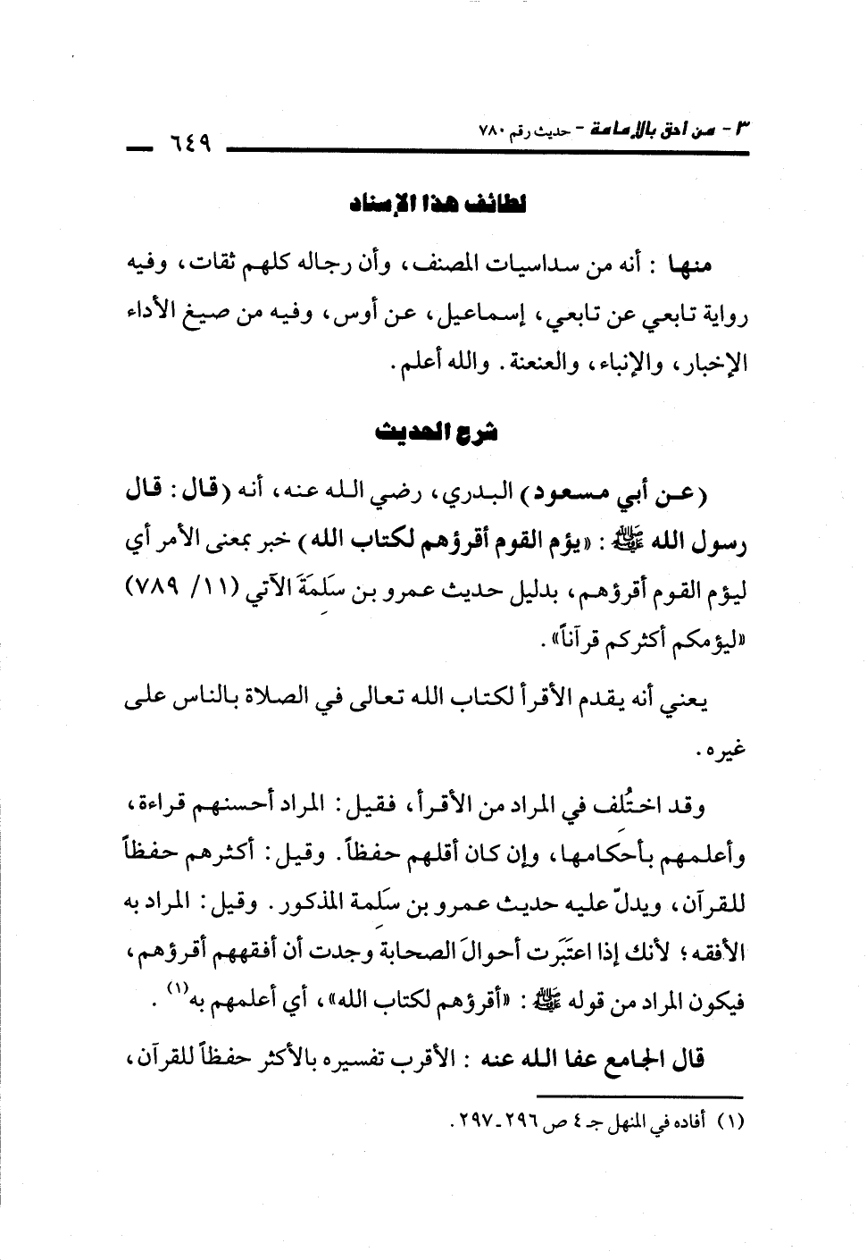 وقد اختُلف في المراد من الأقرأ، فقيل: المراد أحسنهم قراءة، وأعلمهم بأحكامها، وإن كان أقلهم حفظاً. وقيل: أكثرهم حفظاً للقرآن، ويدلّ عليه حديث عمرو بن سَلِمة المذكور. وقيل: المراد به الأفقه؛ لأنك إذا اعتَبَرت أحوالَ الصحابة وجدت أن أفقههم أقرؤهم، فيكون المراد من قوله -صلى الله عليه وسلم-: "أقرؤهم لكتاب الله"، أي أعلمهم به (¬1).