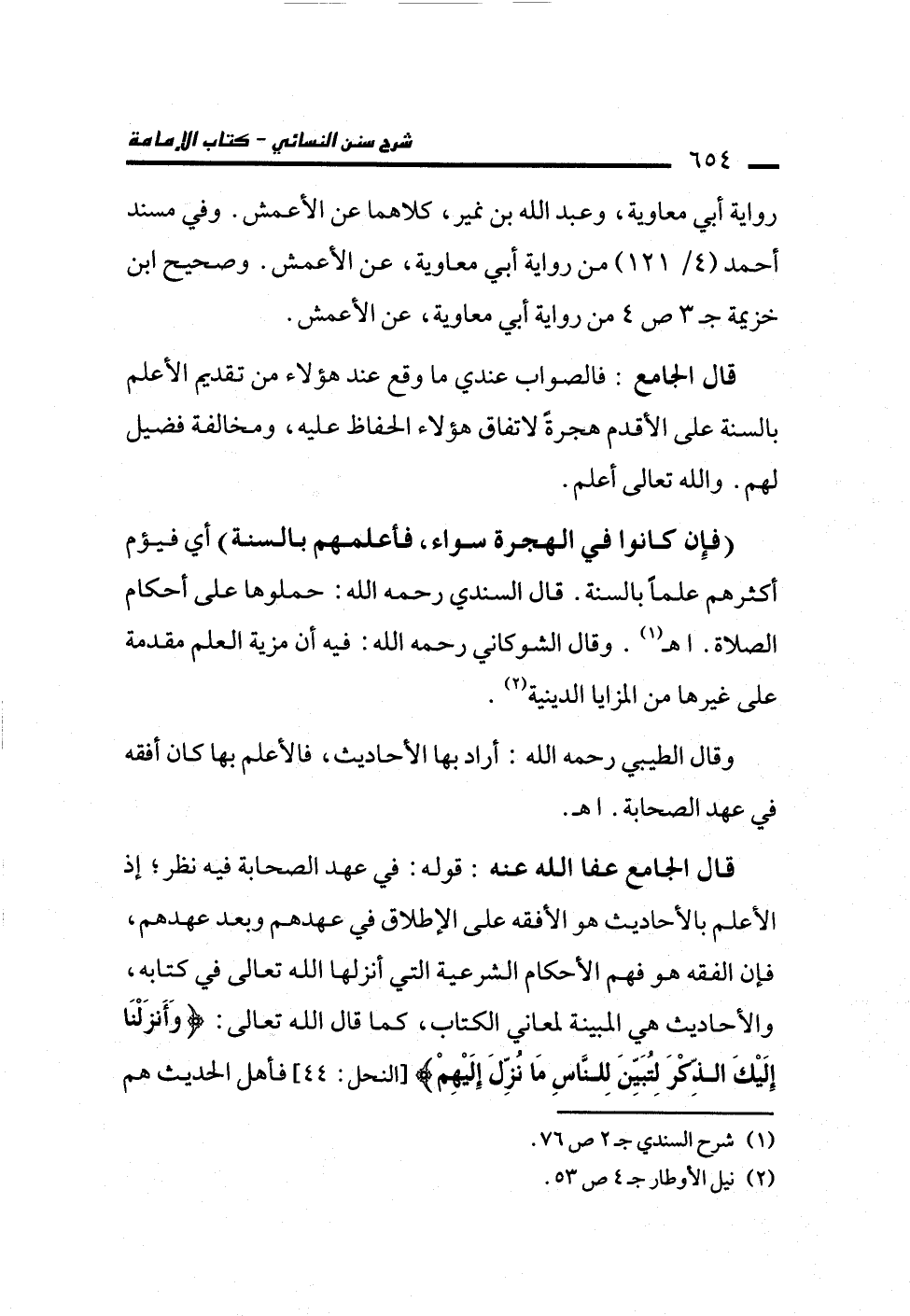 (فإِن كانوا في الهجرة سواء، فأعلمهم بالسنة) أي فيؤم أكثرهم علماً بالسنة. قال السندي رحمه الله: حملوها على أحكام الصلاة. اهـ (¬1). وقال الشوكاني رحمه الله: فيه أن مزية العلم مقدمة على غيرها من المزايا الدينية (¬2).