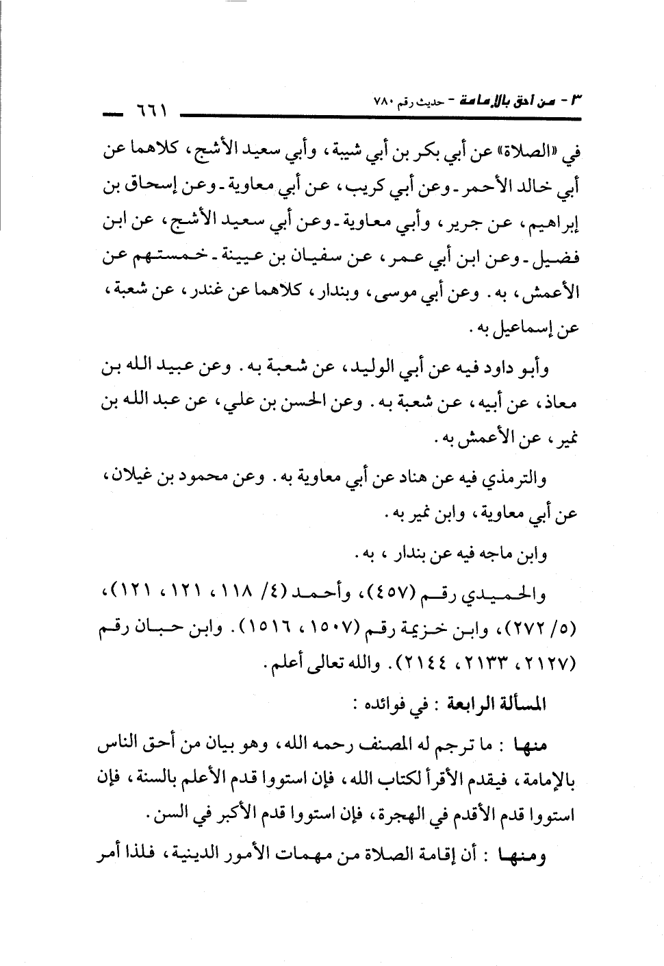 منها: ما ترجم له المصنف رحمه الله، وهو بيان من أحق الناس بالإمامة، فيقدم الأقرأ لكتاب الله، فإن استووا قدم الأعلم بالسنة، فإن استووا قدم الأقدم في الهجرة، فإن استووا قدم الأكبر في السن.