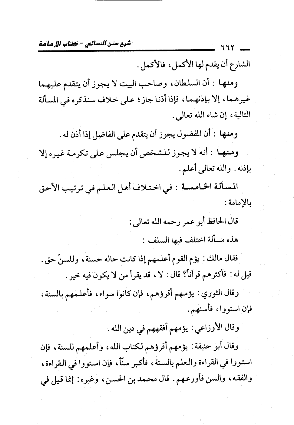 المسألة الخامسة: في اختلاف أهل العلم في ترتيب الأحق بالإمامة:
