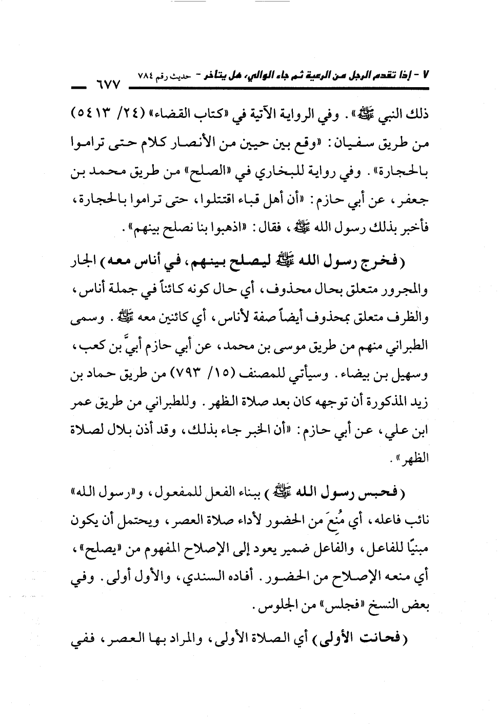 (فخرج رسول الله -صلى الله عليه وسلم- ليصلح بينهم، في أناس معه) الجار والمجرور متعلق بحال محذوف، أي حال كونه كائناً في جملة أناس، والظرف متعلق بمحذوف أيضاً صفة لأناس، أي كائنين معه -صلى الله عليه وسلم-. وسمى الطبراني منهم من طريق موسى بن محمد، عن أبي حازم أبيَّ بن كعب، وسهيل بن بيضاء. وسيأتي للمصنف (15/ 793) من طريق حماد بن زيد المذكورة أن توجهه كان بعد صلاة الظهر. وللطبراني من طريق عمر ابن علي، عن أبي حازم: "أن الخبر جاء بذلك، وقد أذن بلال لصلاة الظهر".